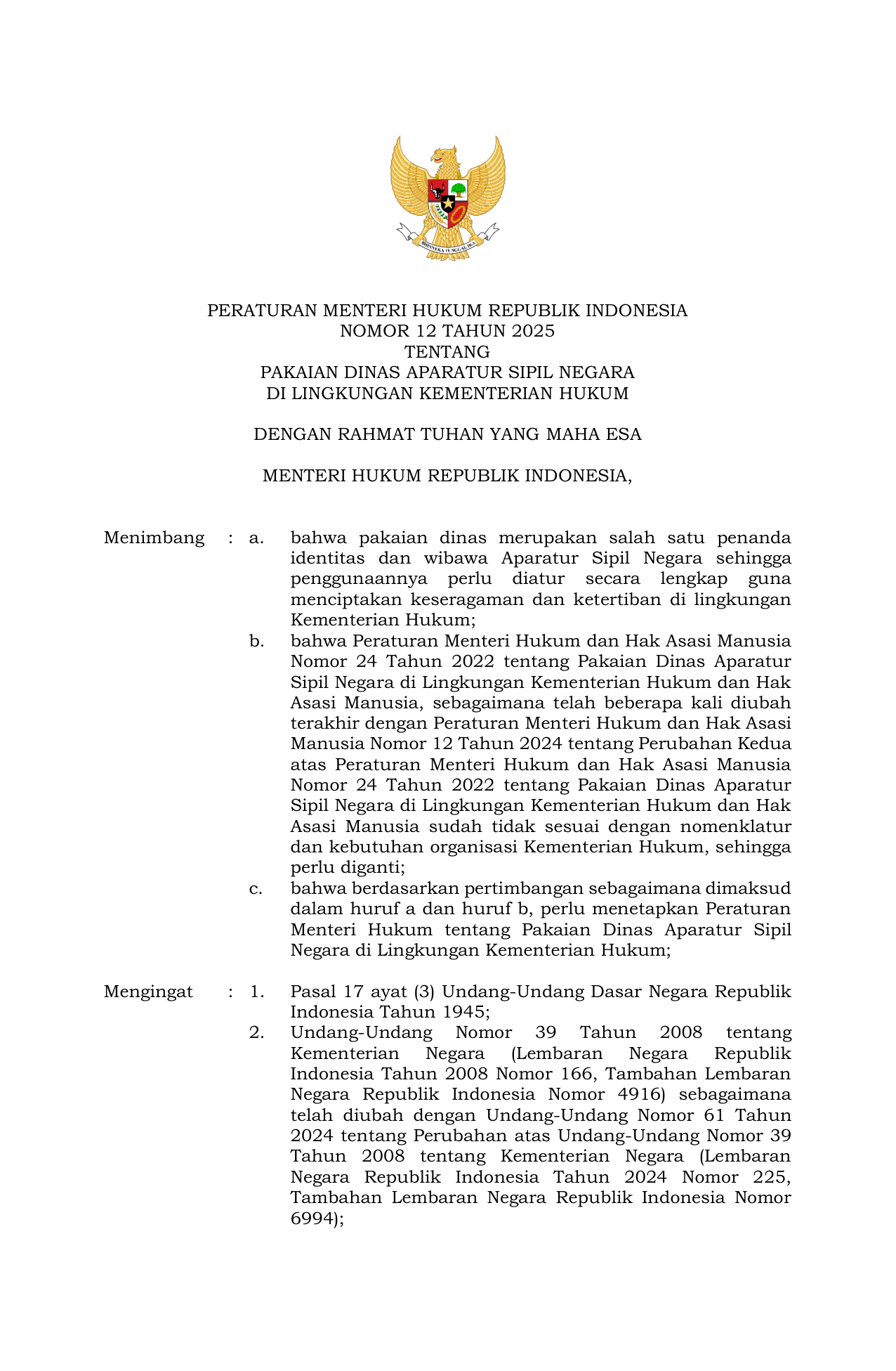 PERMEN Nomor 12 Tahun 2025 | Peraturan Menteri Nomor 12 Tahun 2025 tentang PAKAIAN DINAS APARATUR SIPIL NEGARA DI LINGKUNGAN KEMENTERIAN HUKUM