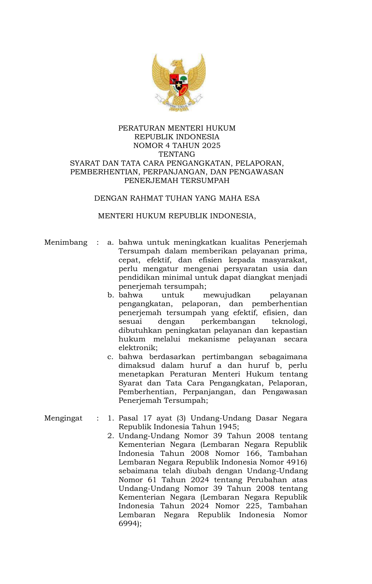 PERMEN Nomor 4 Tahun 2025 | Peraturan Menteri Nomor 4 Tahun 2025 tentang SYARAT DAN TATA CARA PENGANGKATAN PELAPORAN PEMBERHENTIAN PERPANJANGAN DAN PENGAWASAN PENERJEMAH TERSUMPAH