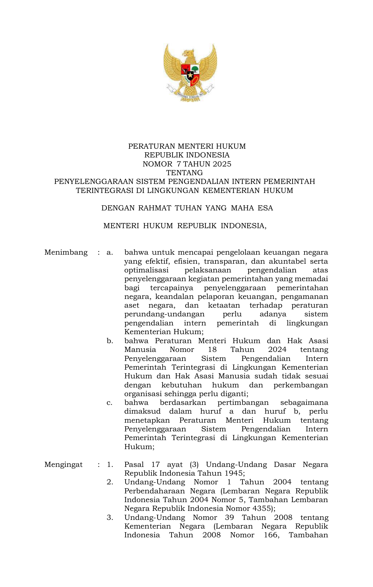 PERMEN Nomor 7 Tahun 2025 | Peraturan Menteri Nomor 7 Tahun 2025 tentang PENYELENGGARAAN SISTEM PENGENDALIAN INTERN PEMERINTAH TERINTEGRASI DI LINGKUNGAN KEMENTERIAN HUKUM