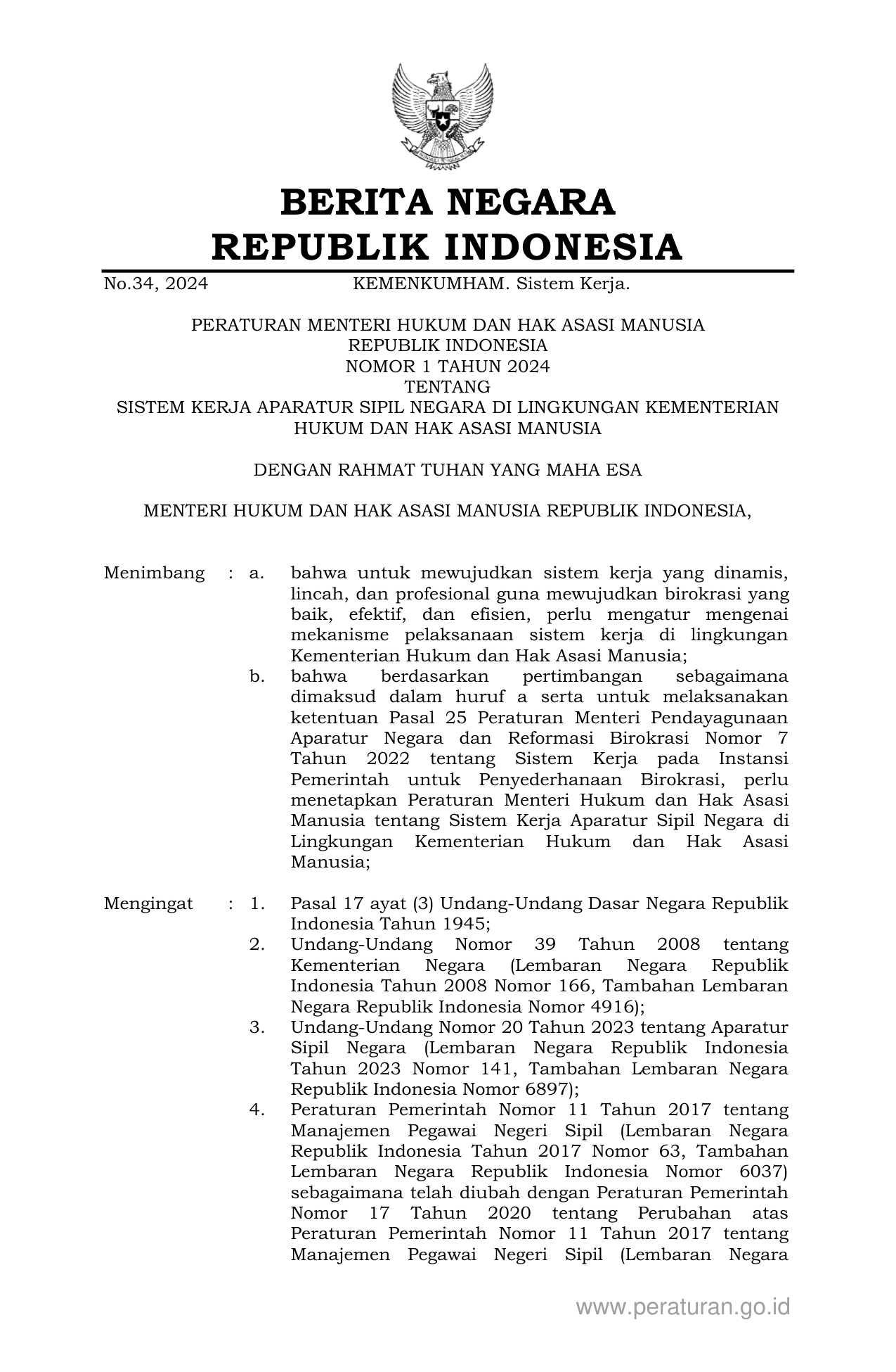 PERMEN Nomor 1 Tahun 2024 | Peraturan Menteri Nomor 1 Tahun 2024 tentang SISTEM KERJA APARATUR SIPIL NEGARA DI LINGKUNGAN KEMENTERIAN HUKUM DAN HAK ASASI MANUSIA