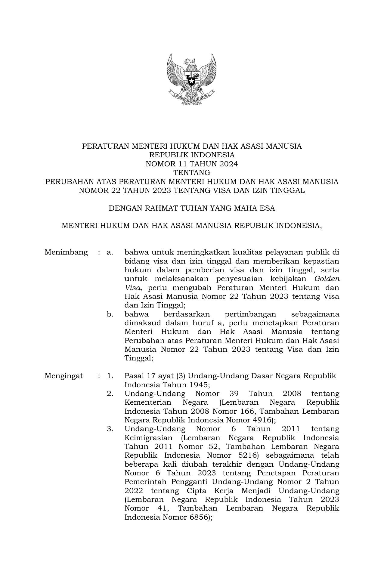 PERMEN Nomor 11 Tahun 2024 | Peraturan Menteri Nomor 11 Tahun 2024 tentang PERUBAHAN ATAS PERATURAN MENTERI HUKUM DAN HAK ASASI MANUSIA NOMOR 22 TAHUN 2023 TENTANG VISA DAN IZIN TINGGAL