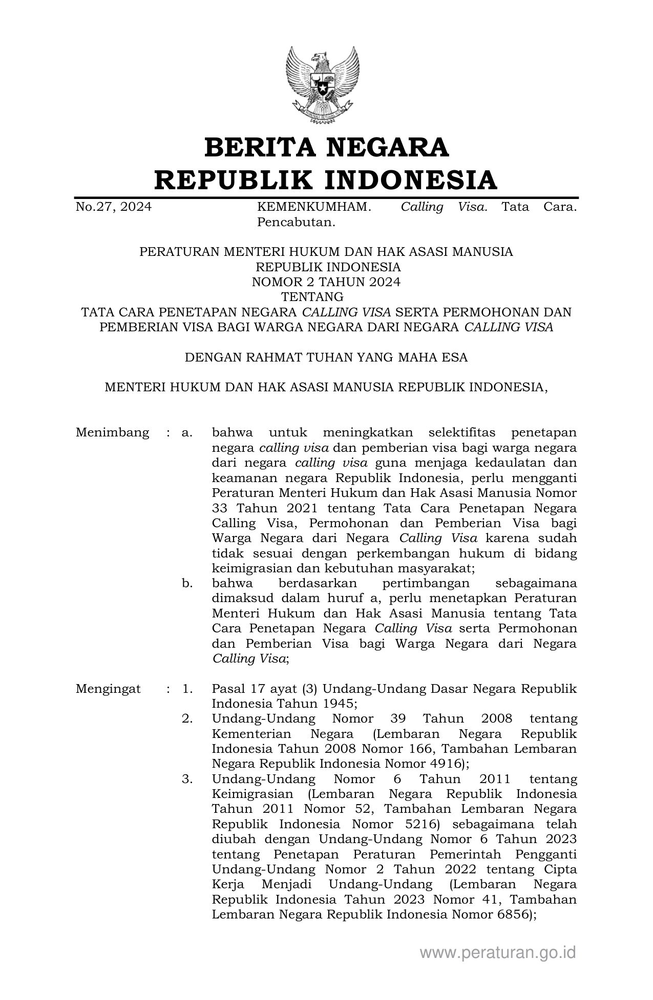 PERMEN Nomor 2 Tahun 2024 | Peraturan Menteri Nomor 2 Tahun 2024 tentang TATA CARA PENETAPAN NEGARA CALLING VISA SERTA PERMOHONAN DAN PEMBERIAN VISA BAGI WARGA NEGARA DARI NEGARA CALLING VISA