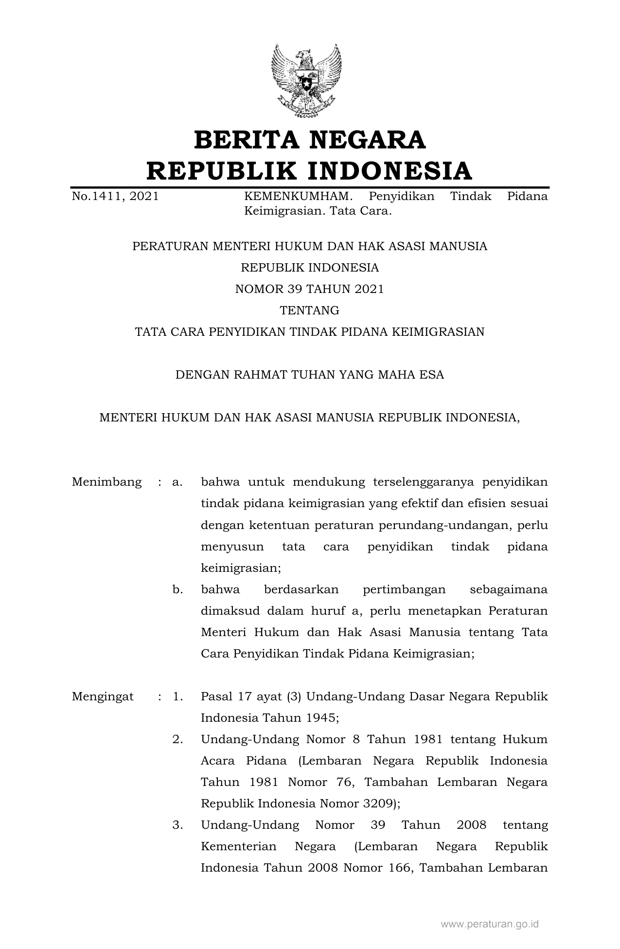 PERMEN Nomor 39 Tahun 2021 | Peraturan Menteri Nomor 39 Tahun 2021 tentang TATA CARA PENYIDIKAN TINDAK PIDANA KEIMIGRASIAN
