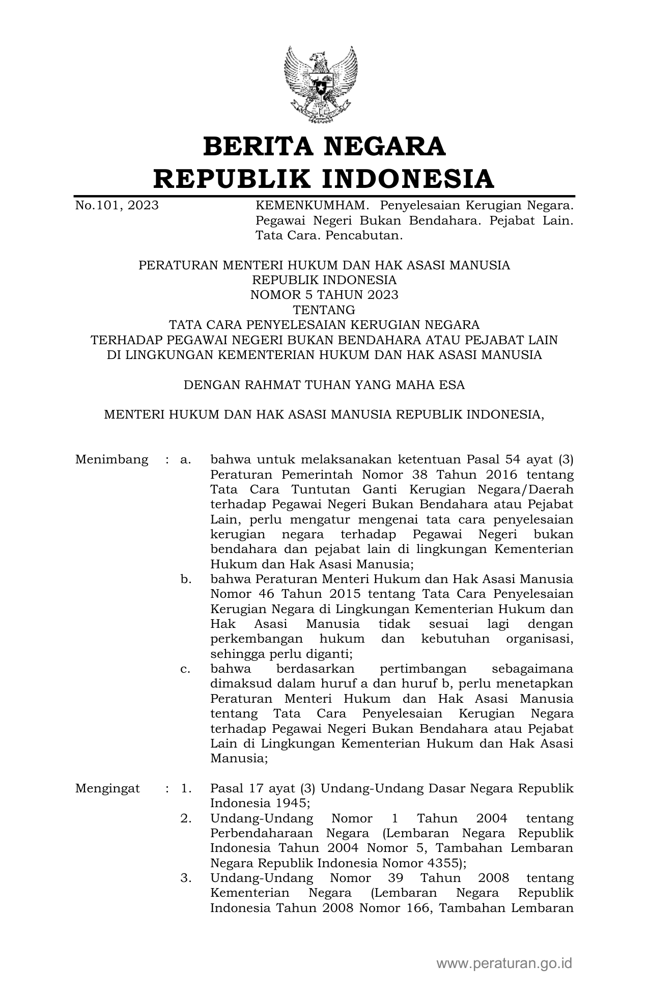 PERMEN Nomor 5 Tahun 2023 | Peraturan Menteri Nomor 5 Tahun 2023 tentang TATA CARA PENYELESAIAN KERUGIAN NEGARA TERHADAP PEGAWAI NEGERI BUKAN BENDAHARA ATAU PEJABAT LAIN DI LINGKUNGAN KEMENTERIAN HUKUM DAN HAK ASASI MANUSIA