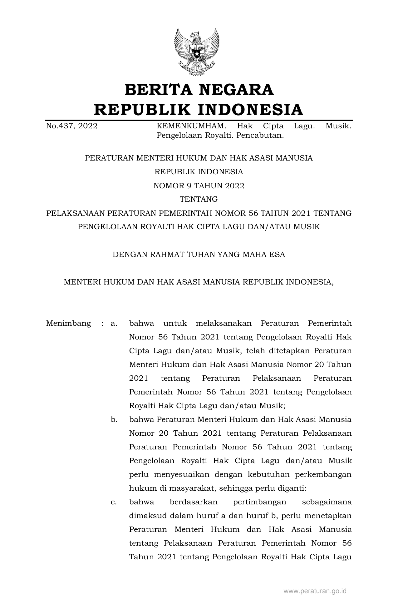 PERMEN Nomor 9 Tahun 2022 | Peraturan Menteri Nomor 9 Tahun 2022 tentang PELAKSANAAN PERATURAN PEMERINTAH NOMOR 56 TAHUN 2021 TENTANG PENGELOLAAN ROYALTI HAK CIPTA LAGU DAN/ATAU MUSIK