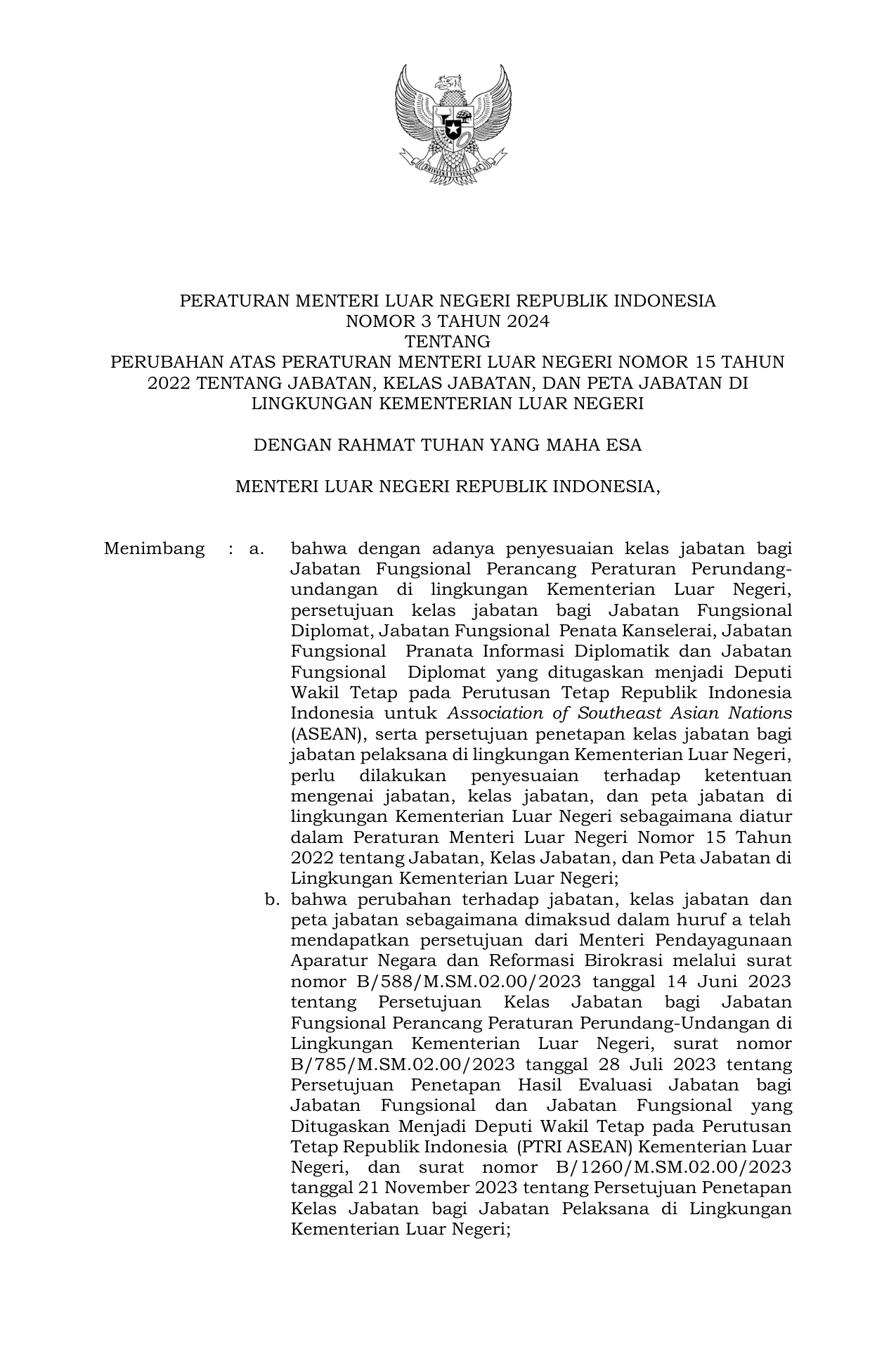 NOMOR 3 TAHUN 2024 TENTANG PERUBAHAN ATAS PERATURAN MENTERI LUAR NEGERI NOMOR 15 TAHUN 2022 TENTANG JABATAN, KELAS JABATAN, DAN PETA JABATAN DI LINGKUNGAN KEMENTERIAN LUAR NEGERI