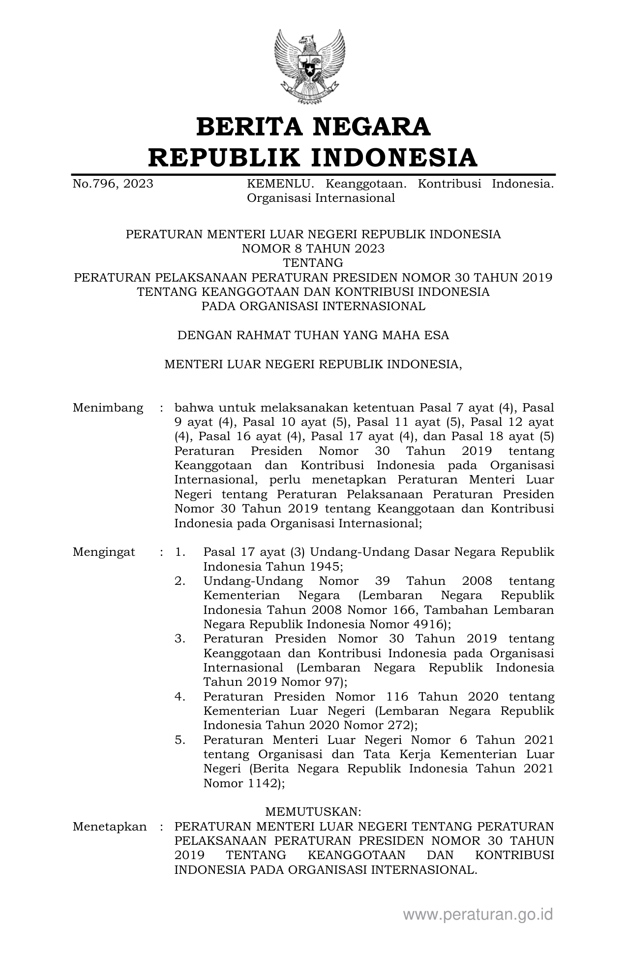 PERMEN Nomor 8 Tahun 2023 | Peraturan Menteri Nomor 8 Tahun 2023 tentang PERATURAN PELAKSANAAN PERATURAN PRESIDEN NOMOR 30 TAHUN 2019 TENTANG KEANGGOTAAN DAN KONTRIBUSI INDONESIA PADA ORGANISASI INTERNASIONAL