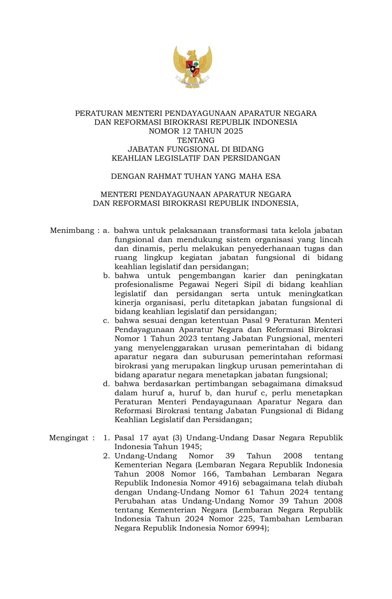 PERMEN Nomor 12 Tahun 2025 | Peraturan Menteri Nomor 12 Tahun 2025 tentang Jabatan Fungsional di BIdang Keahlian Legislatif dan Persidangan