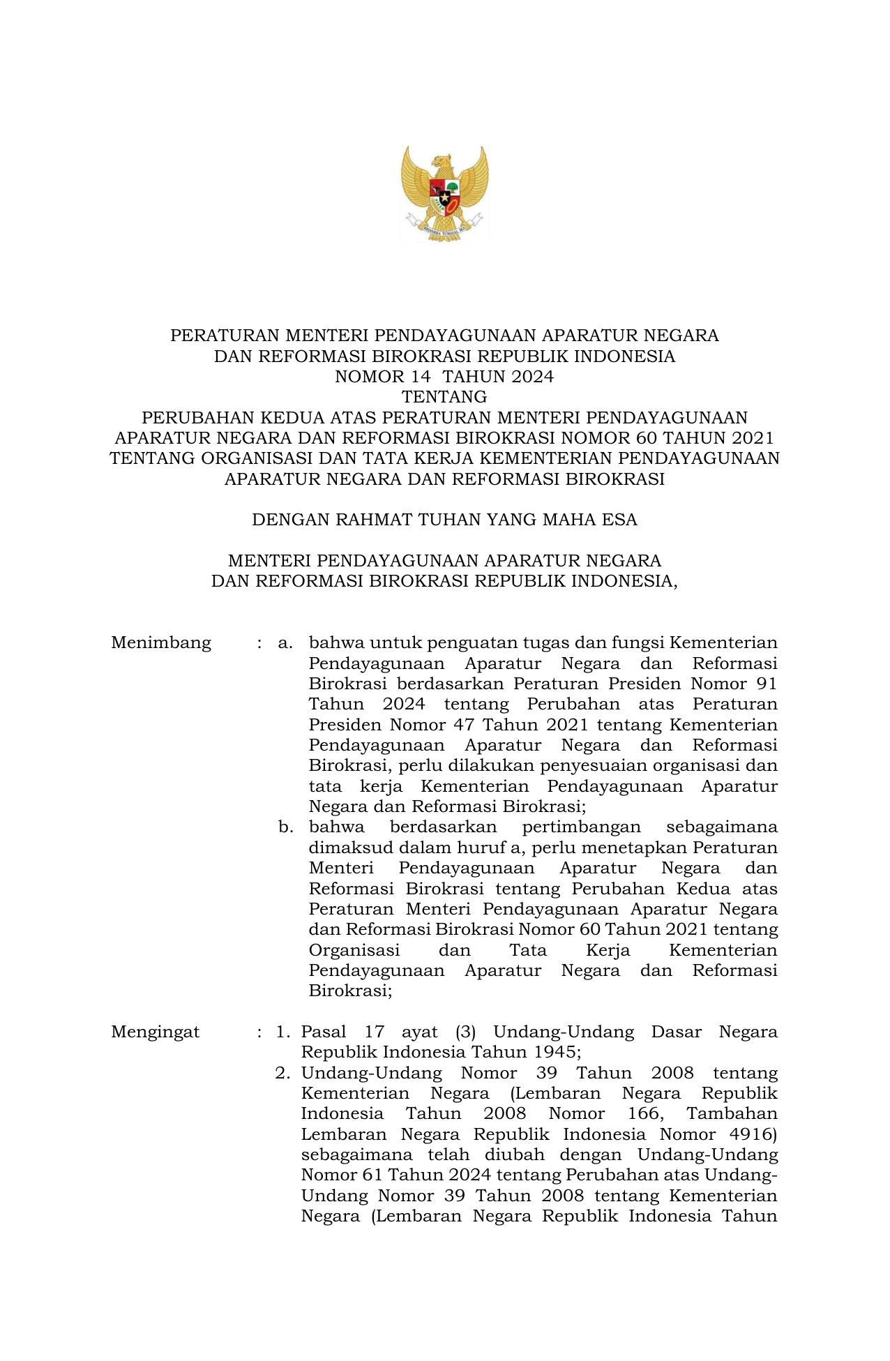 PERMEN Nomor 14 Tahun 2024 | Peraturan Menteri Nomor 14 Tahun 2024 tentang Perubahan Kedua atas Peraturan Menteri Pendayagunaan Aparatur Negara dan Reformasi Birokrasi Nomor 60 Tahun 2021 tentang Organisasi dan Tata Kerja Kementeri Pendayagunaan Aparatur Negara dan Reformasi Birokrasi