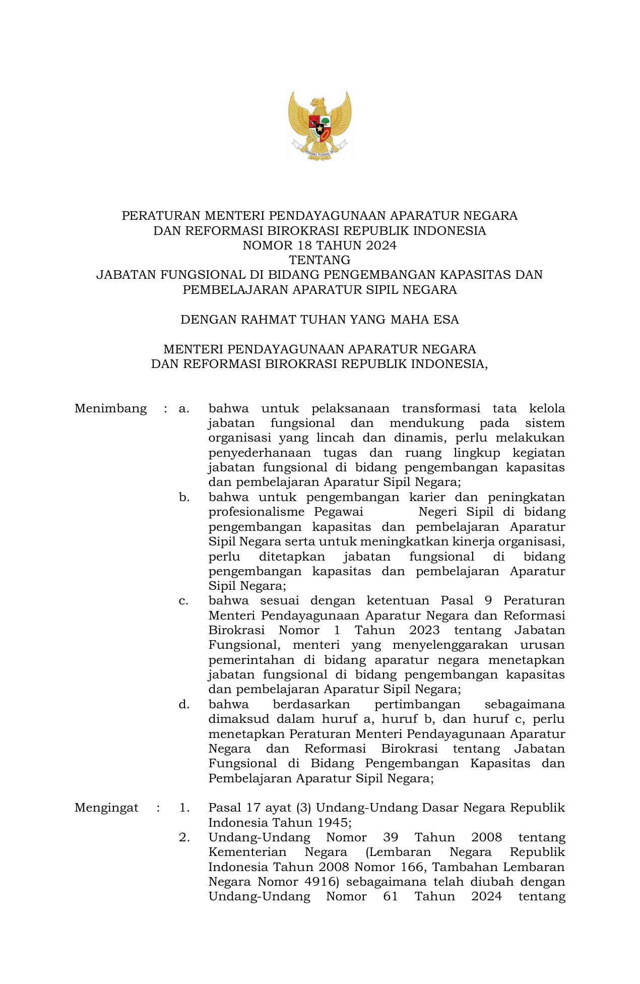 PERMEN Nomor 18 Tahun 2024 | Peraturan Menteri Nomor 18 Tahun 2024 tentang Jabatan Fungsional Di Bidang Pengembangan Kapasitas dan Pembelajaran Aparatur Sipil Negara