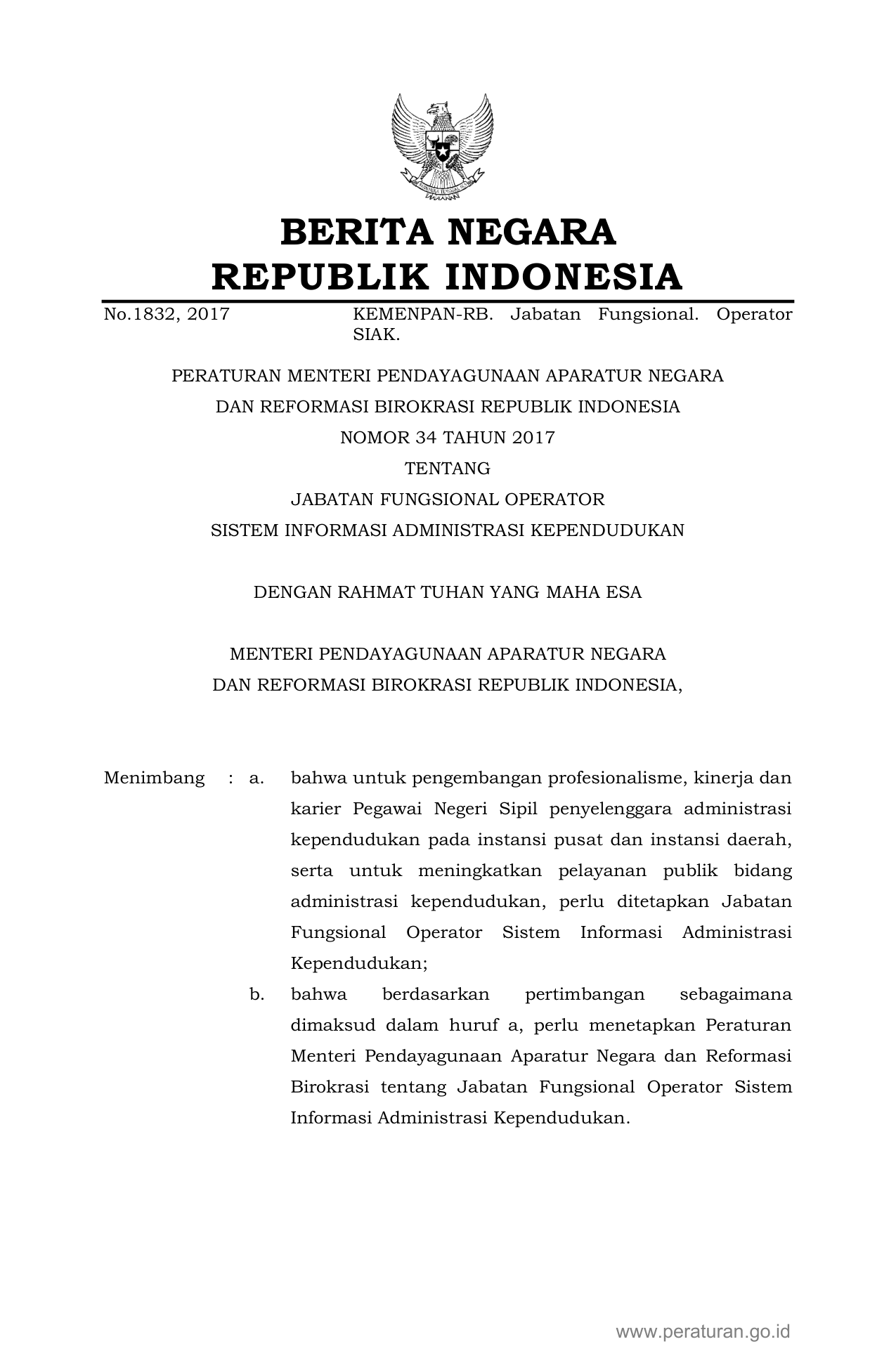 PERMEN Nomor 34 Tahun 2017 | Peraturan Menteri Nomor 34 Tahun 2017 tentang Jabatan Fungsional Operator Sistem Informasi Administrasi Kependudukan