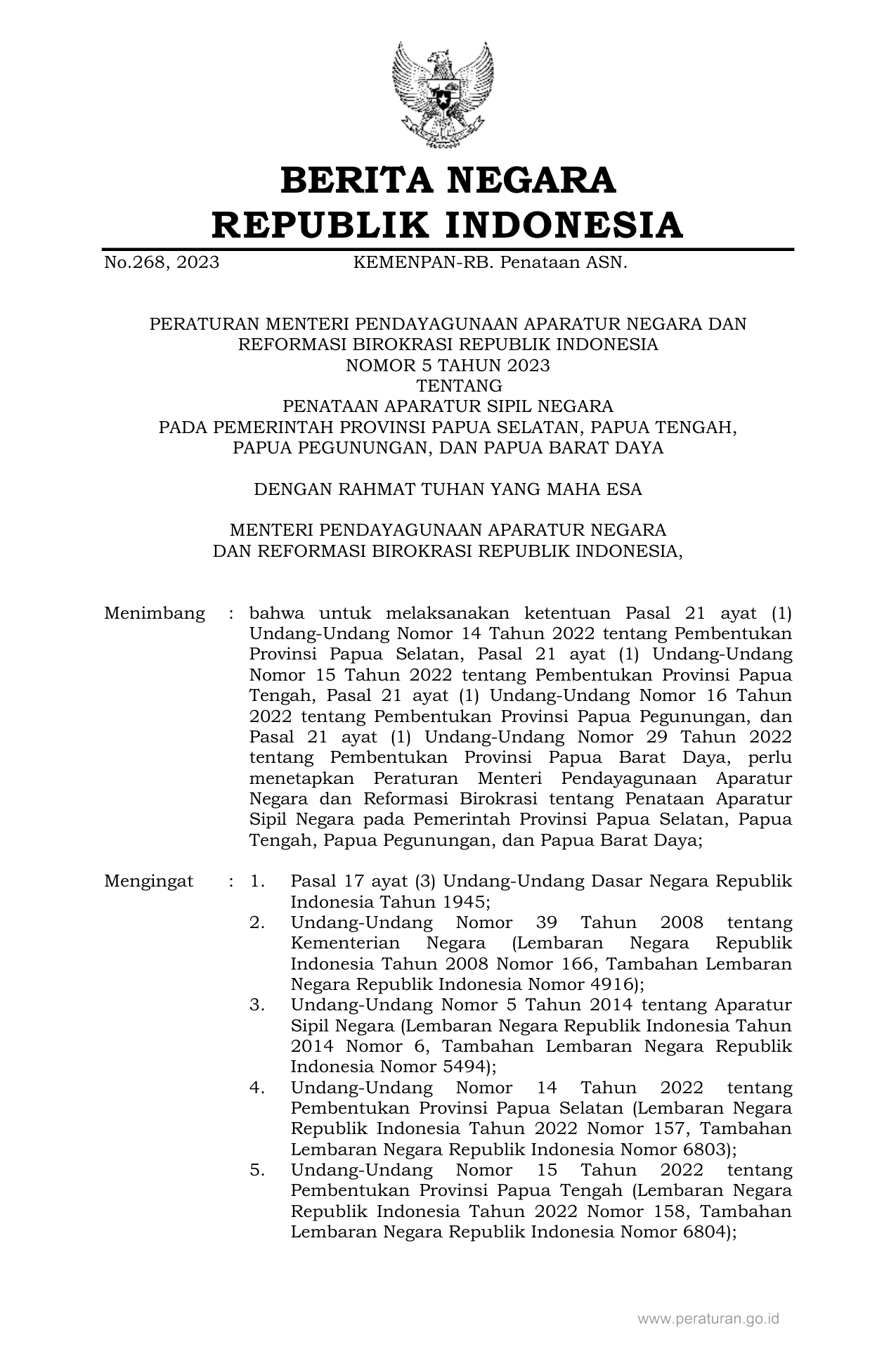 PERMEN Nomor 5 Tahun 2023 | Peraturan Menteri Nomor 5 Tahun 2023 tentang PENATAAN APARATUR SIPIL NEGARA PADA PEMERINTAH PROVINSI PAPUA SELATAN, PAPUA TENGAH, PAPUA PEGUNUNGAN, DAN PAPUA BARAT DAYA