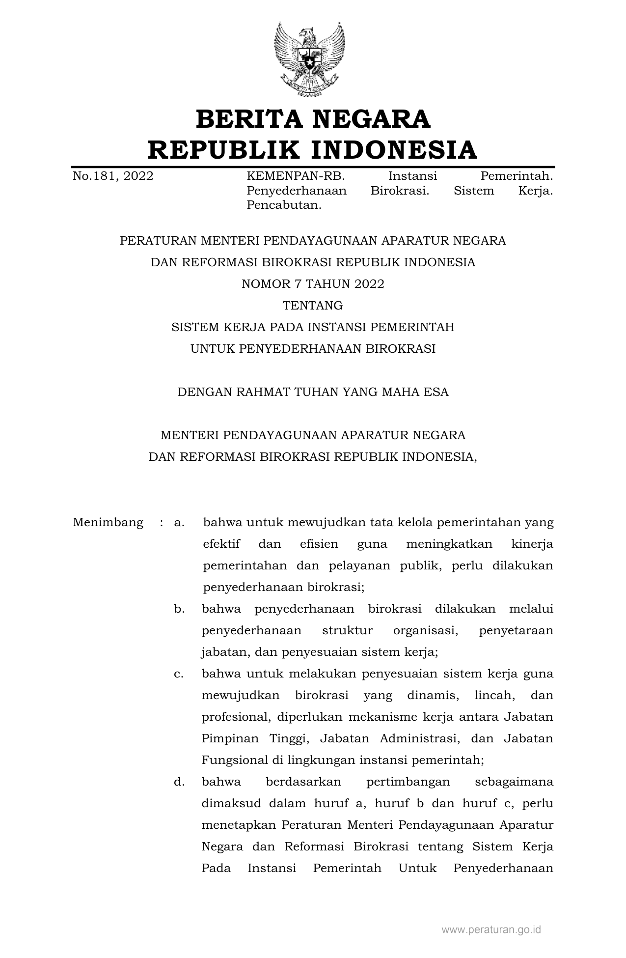 PERMEN Nomor 7 Tahun 2022 | Peraturan Menteri Nomor 7 Tahun 2022 tentang SISTEM KERJA PADA INSTANSI PEMERINTAH UNTUK PENYEDERHANAAN BIROKRASI