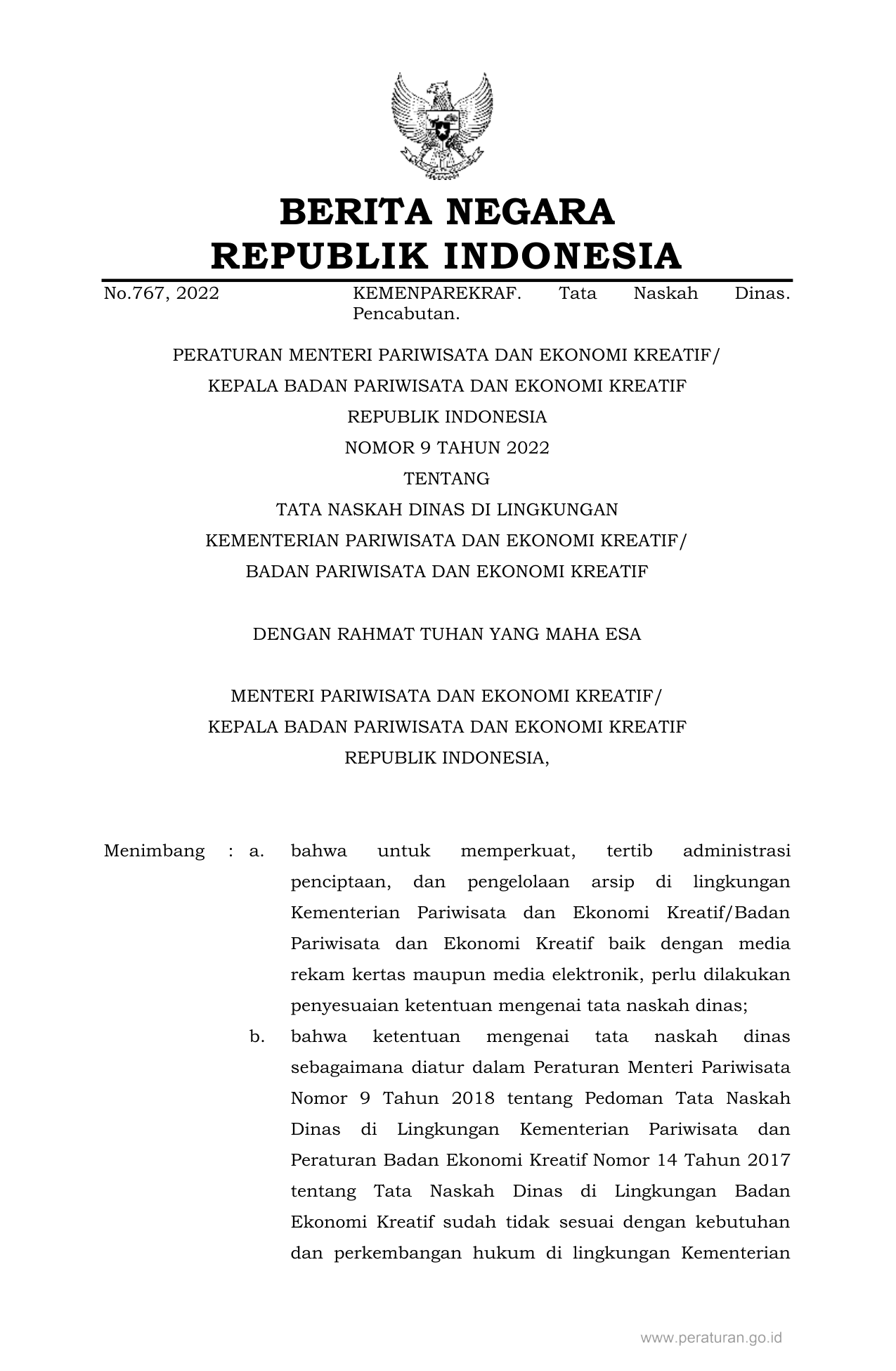 PERMEN Nomor 9 Tahun 2022 | Peraturan Menteri Nomor 9 Tahun 2022 tentang TATA NASKAH DINAS DI LINGKUNGAN KEMENTERIAN PARIWISATA DAN EKONOMI KREATIF/ BADAN PARIWISATA DAN EKONOMI KREATIF
