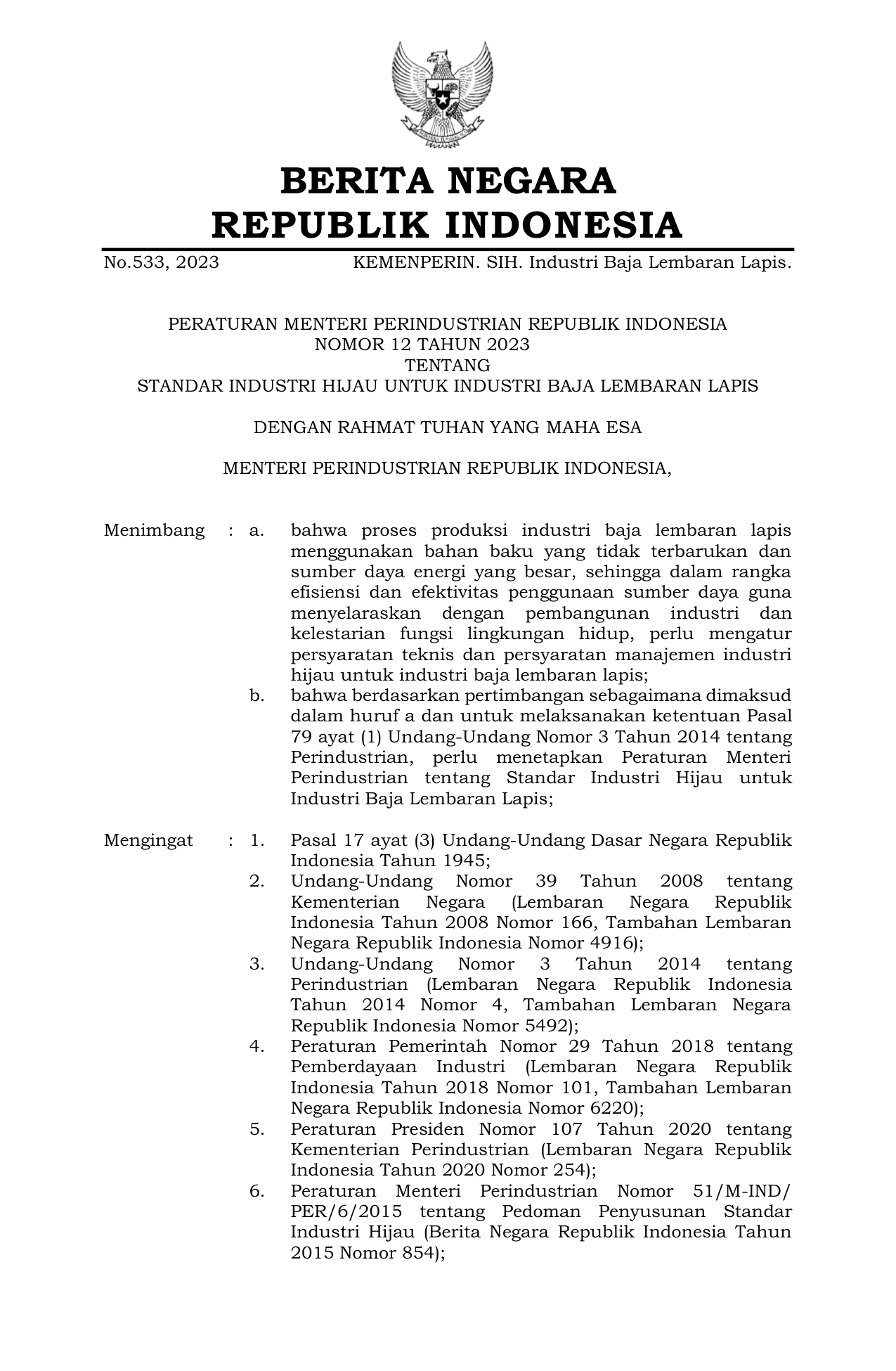 PERMEN Nomor 12 Tahun 2023 | Peraturan Menteri Nomor 12 Tahun 2023 tentang STANDAR INDUSTRI HIJAU UNTUK INDUSTRI BAJA LEMBARAN LAPIS