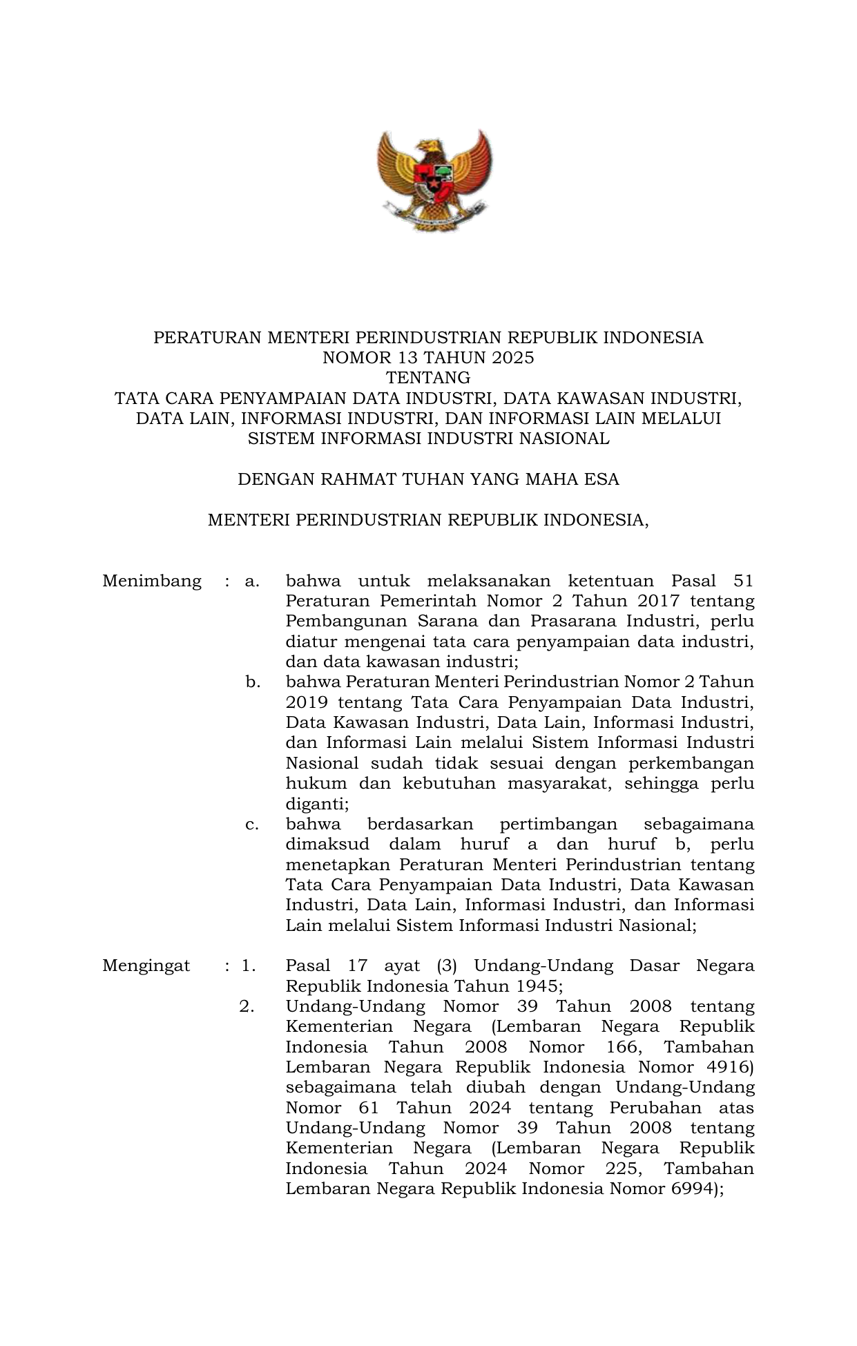 PERMEN Nomor 13 Tahun 2025 | Peraturan Menteri Nomor 13 Tahun 2025 tentang Tata Cara Penyampaian Data Industri Data Kawasan Industri Data Lain Informasi Industri Dan Informasi Lain Melalui Sistem Informasi Industri Nasional