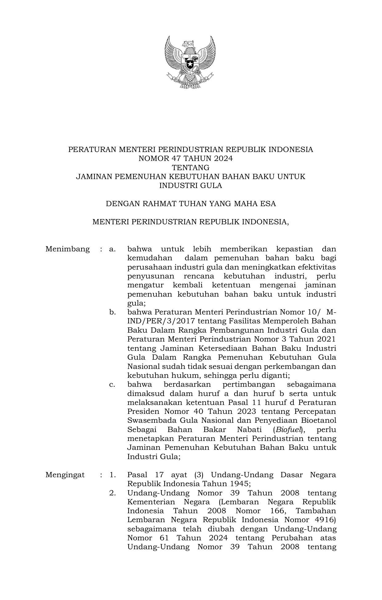 PERMEN Nomor 47 Tahun 2024 | Peraturan Menteri Nomor 47 Tahun 2024 tentang Jaminan Pemenuhan Kebutuhan Bahan Baku untuk Industri Gula