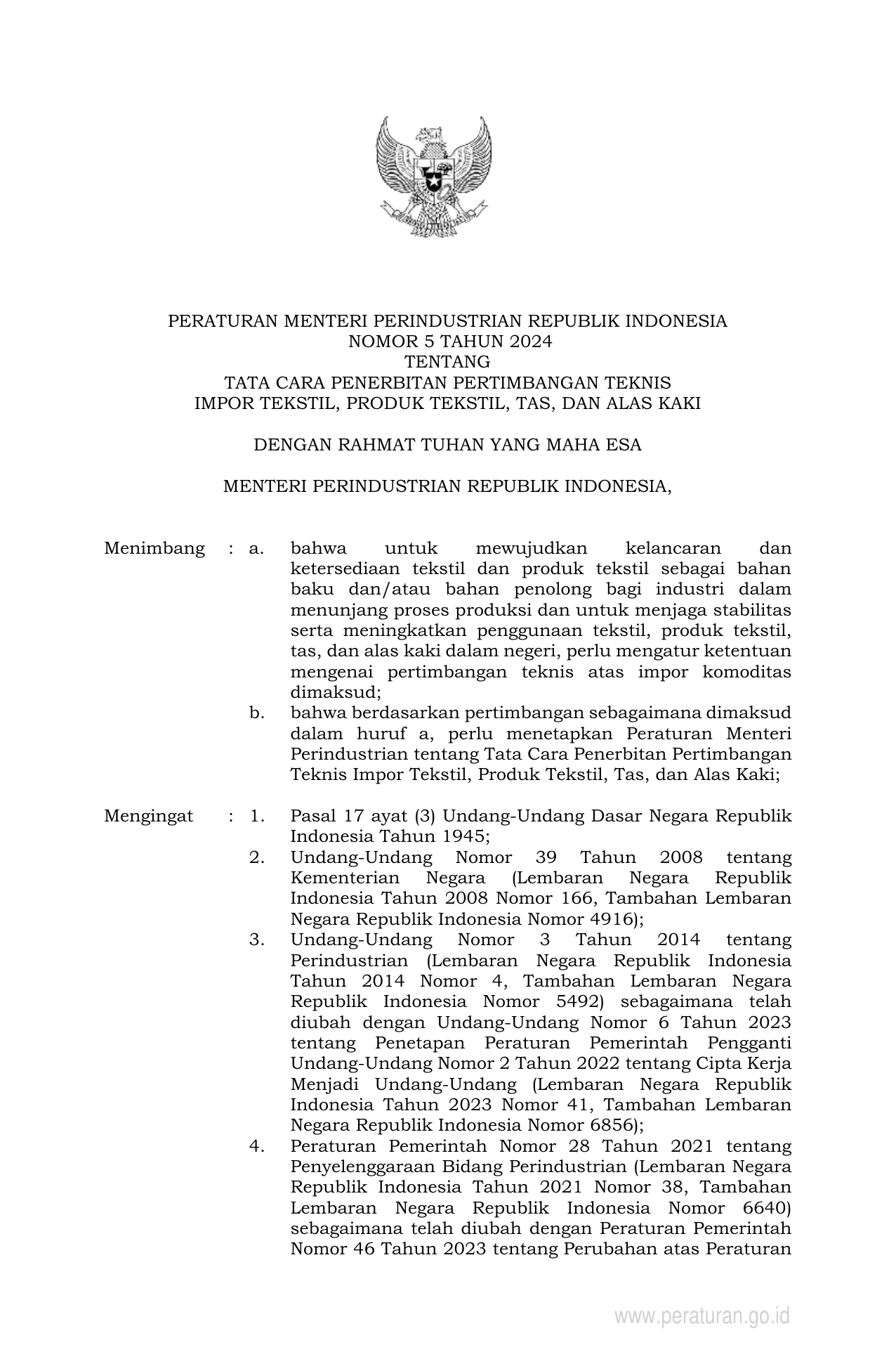 PERMEN Nomor 5 Tahun 2024 | Peraturan Menteri Nomor 5 Tahun 2024 tentang TATA CARA PENERBITAN PERTIMBANGAN TEKNIS IMPOR TEKSTIL, PRODUK TEKSTIL, TAS, DAN ALAS KAKI