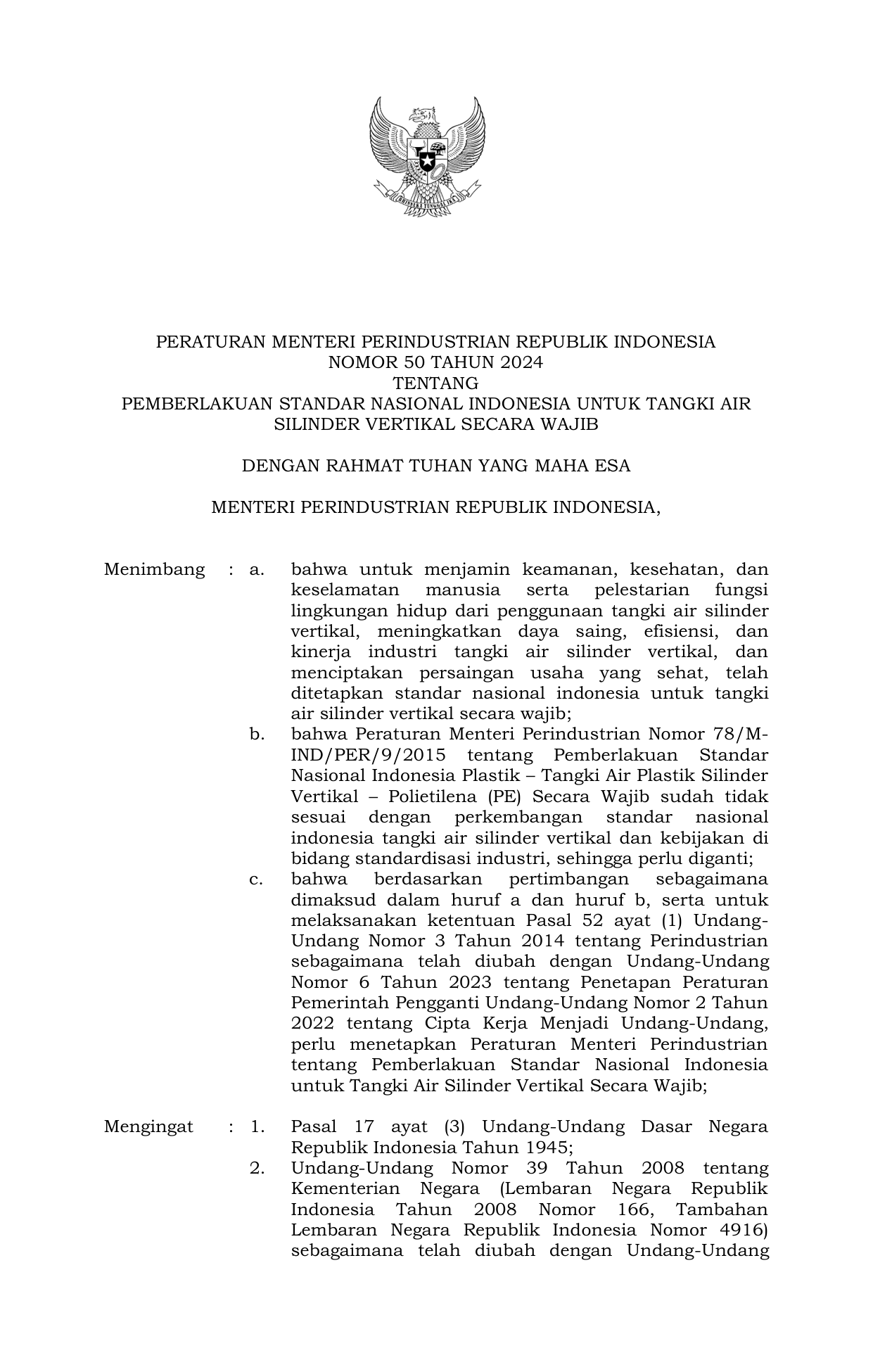 PERMEN Nomor 50 Tahun 2024 | Peraturan Menteri Nomor 50 Tahun 2024 tentang Pemberlakuan Standar Nasional Indonesia Untuk Tangki Air Silinder Vertikal Secara Wajib