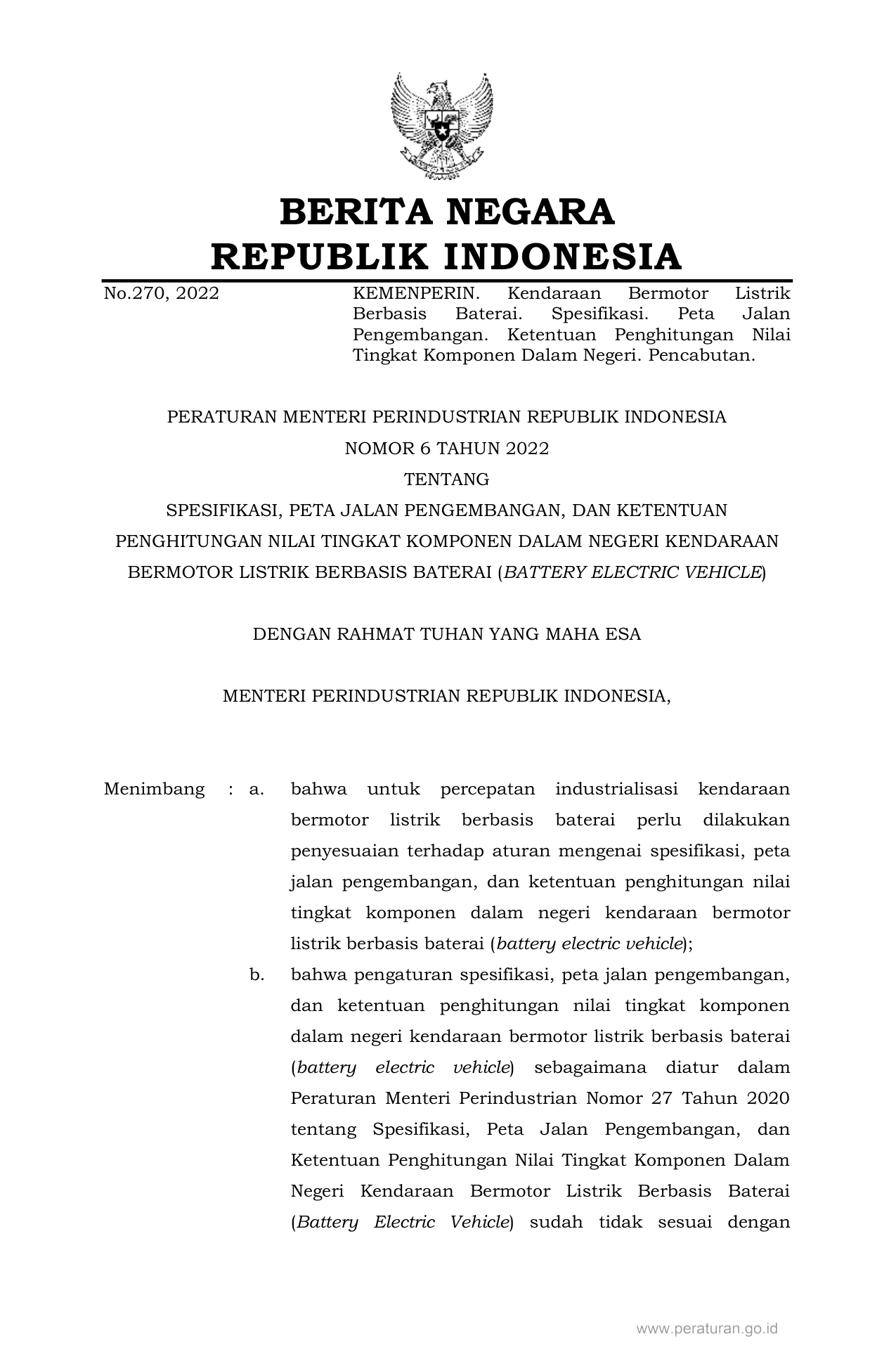 PERMEN Nomor 6 Tahun 2022 | Peraturan Menteri Nomor 6 Tahun 2022 tentang SPESIFIKASI, PETA JALAN PENGEMBANGAN, DAN KETENTUAN PENGHITUNGAN NILAI TINGKAT KOMPONEN DALAM NEGERI KENDARAAN BERMOTOR LISTRIK BERBASIS BATERAI (BATTERY ELECTRIC VEHICLE)