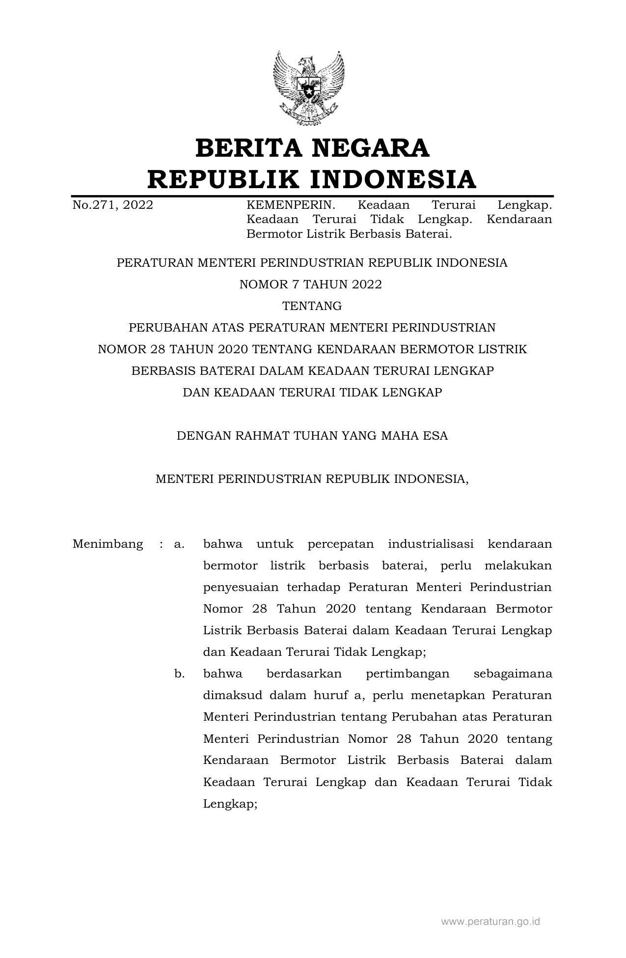 PERMEN Nomor 7 Tahun 2022 | Peraturan Menteri Nomor 7 Tahun 2022 tentang PERUBAHAN ATAS PERATURAN MENTERI PERINDUSTRIAN NOMOR 28 TAHUN 2020 TENTANG KENDARAAN BERMOTOR LISTRIK BERBASIS BATERAI DALAM KEADAAN TERURAI LENGKAP DAN KEADAAN TERURAI TIDAK LENGKAP