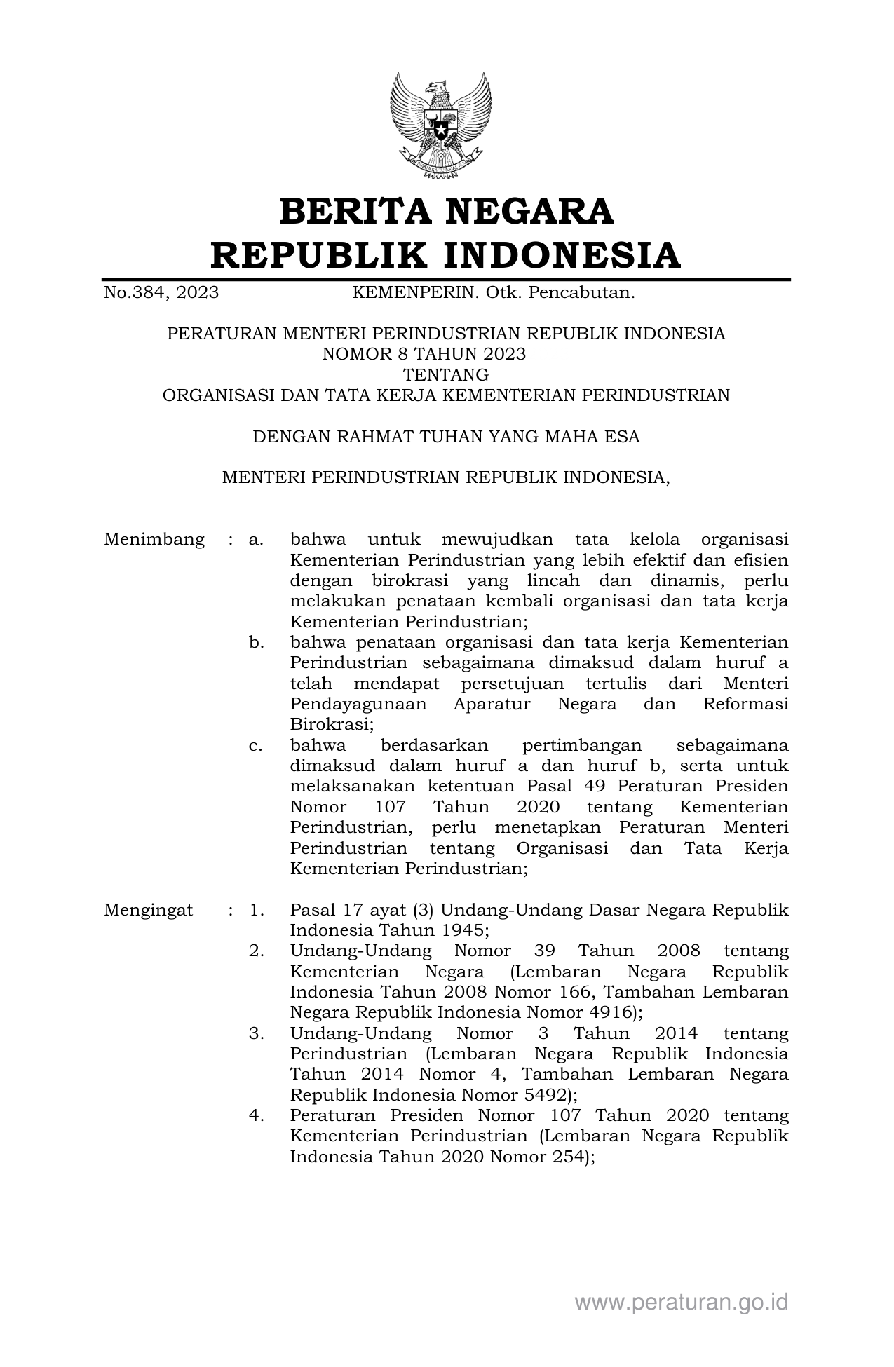 PERMEN Nomor 8 Tahun 2023 | Peraturan Menteri Nomor 8 Tahun 2023 tentang ORGANISASI DAN TATA KERJA KEMENTERIAN PERINDUSTRIAN