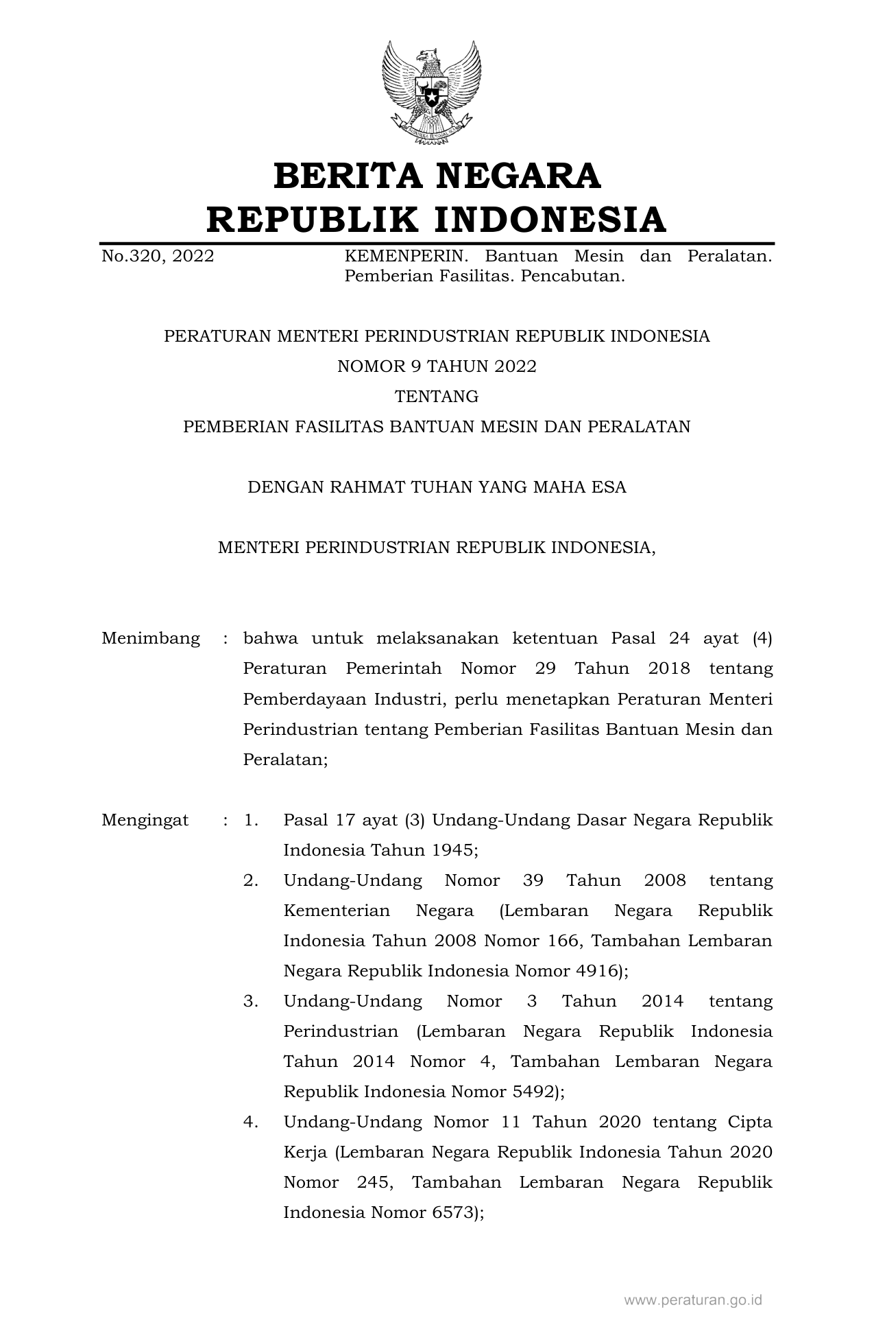 PERMEN Nomor 9 Tahun 2022 | Peraturan Menteri Nomor 9 Tahun 2022 tentang PEMBERIAN FASILITAS BANTUAN MESIN DAN PERALATAN
