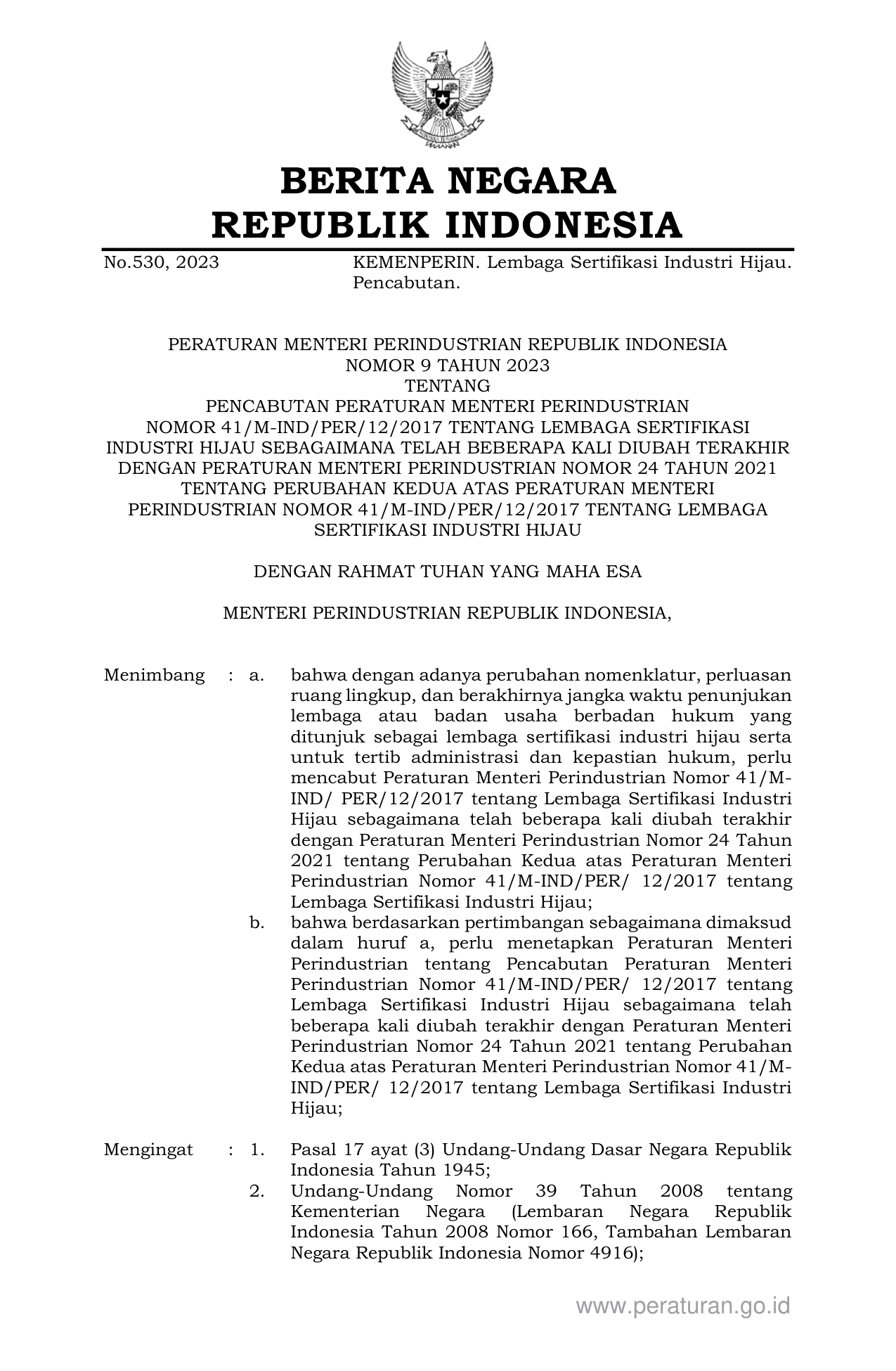 PERMEN Nomor 9 Tahun 2023 | Peraturan Menteri Nomor 9 Tahun 2023 tentang PENCABUTAN PERATURAN MENTERI PERINDUSTRIAN NOMOR 41/M-IND/PER/12/2017 TENTANG LEMBAGA SERTIFIKASI INDUSTRI HIJAU SEBAGAIMANA TELAH BEBERAPA KALI DIUBAH TERAKHIR DENGAN PERATURAN MENTERI PERINDUSTRIAN NOMOR 24 TAHUN 2021 TENTANG PERUBAHAN KEDUA ATAS PERATURAN MENTERI PERINDUSTRIAN NOMOR 41/M-IND/PER/12/2017 TENTANG LEMBAGA SERTIFIKASI INDUSTRI HIJAU