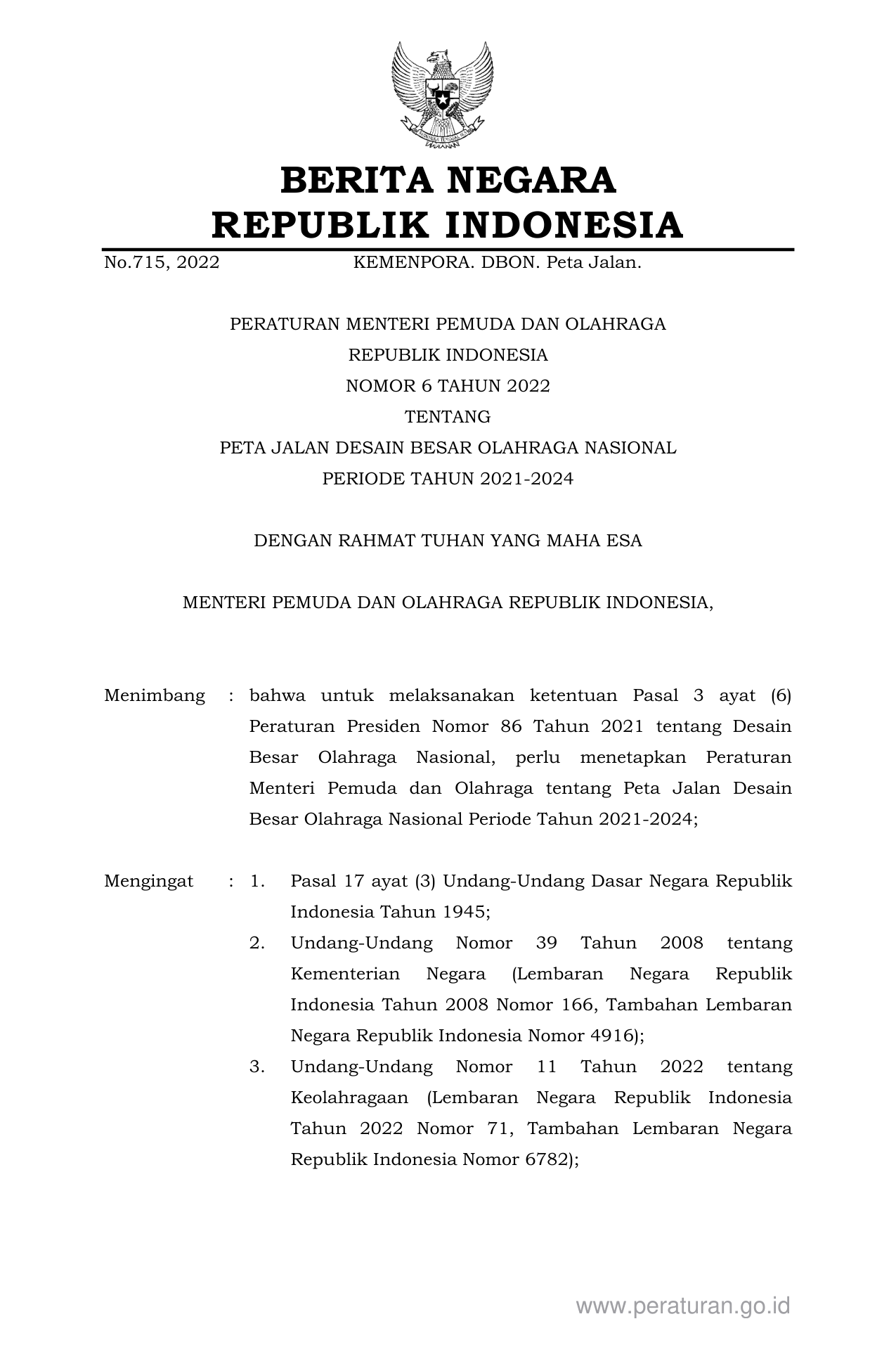 PERMEN Nomor 6 Tahun 2022 | Peraturan Menteri Nomor 6 Tahun 2022 tentang PETA JALAN DESAIN BESAR OLAHRAGA NASIONAL PERIODE TAHUN 2021-2024