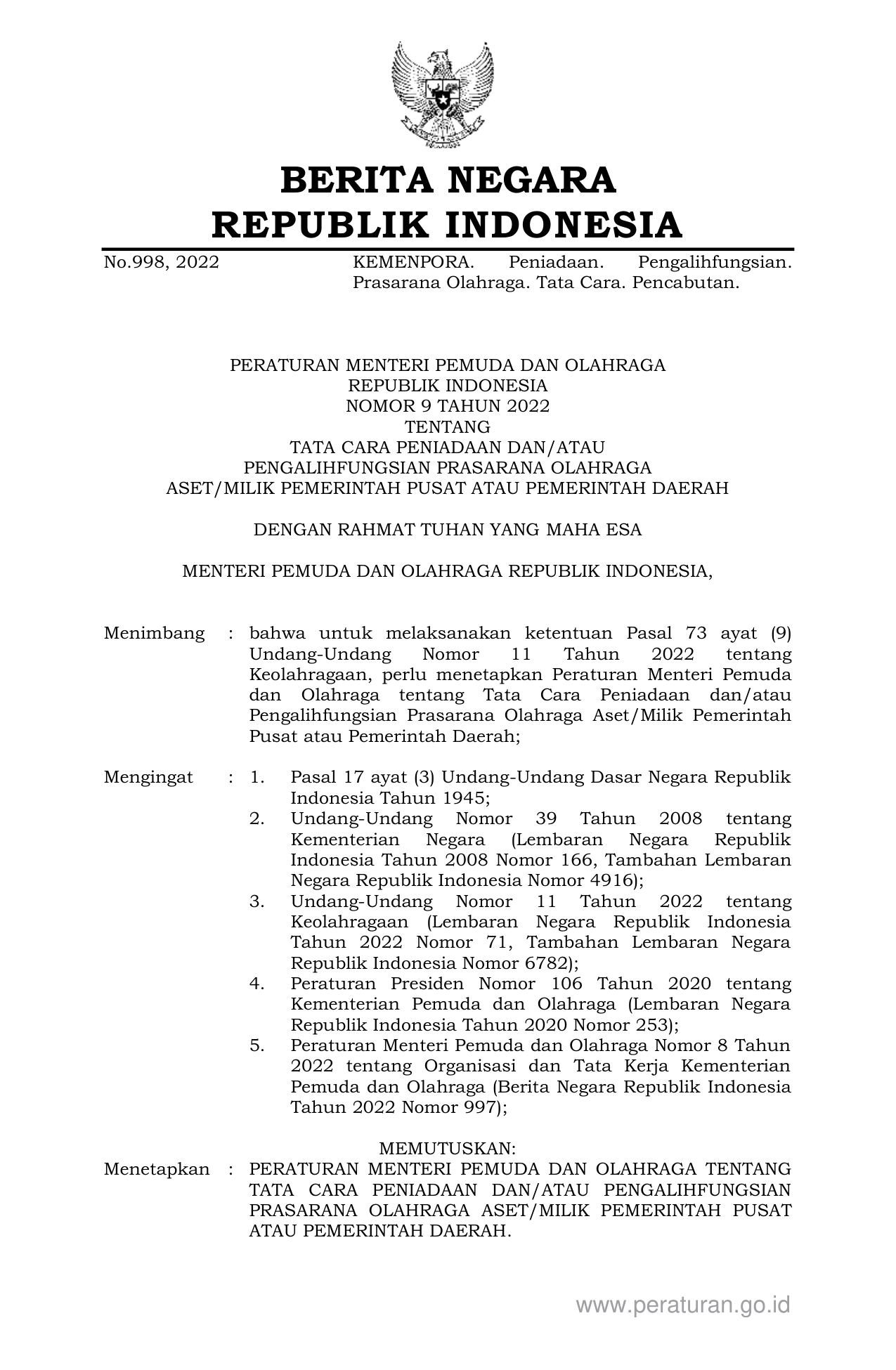 PERMEN Nomor 9 Tahun 2022 | Peraturan Menteri Nomor 9 Tahun 2022 tentang TATA CARA PENIADAAN DAN/ATAU PENGALIHFUNGSIAN PRASARANA OLAHRAGA ASET/MILIK PEMERINTAH PUSAT ATAU PEMERINTAH DAERAH