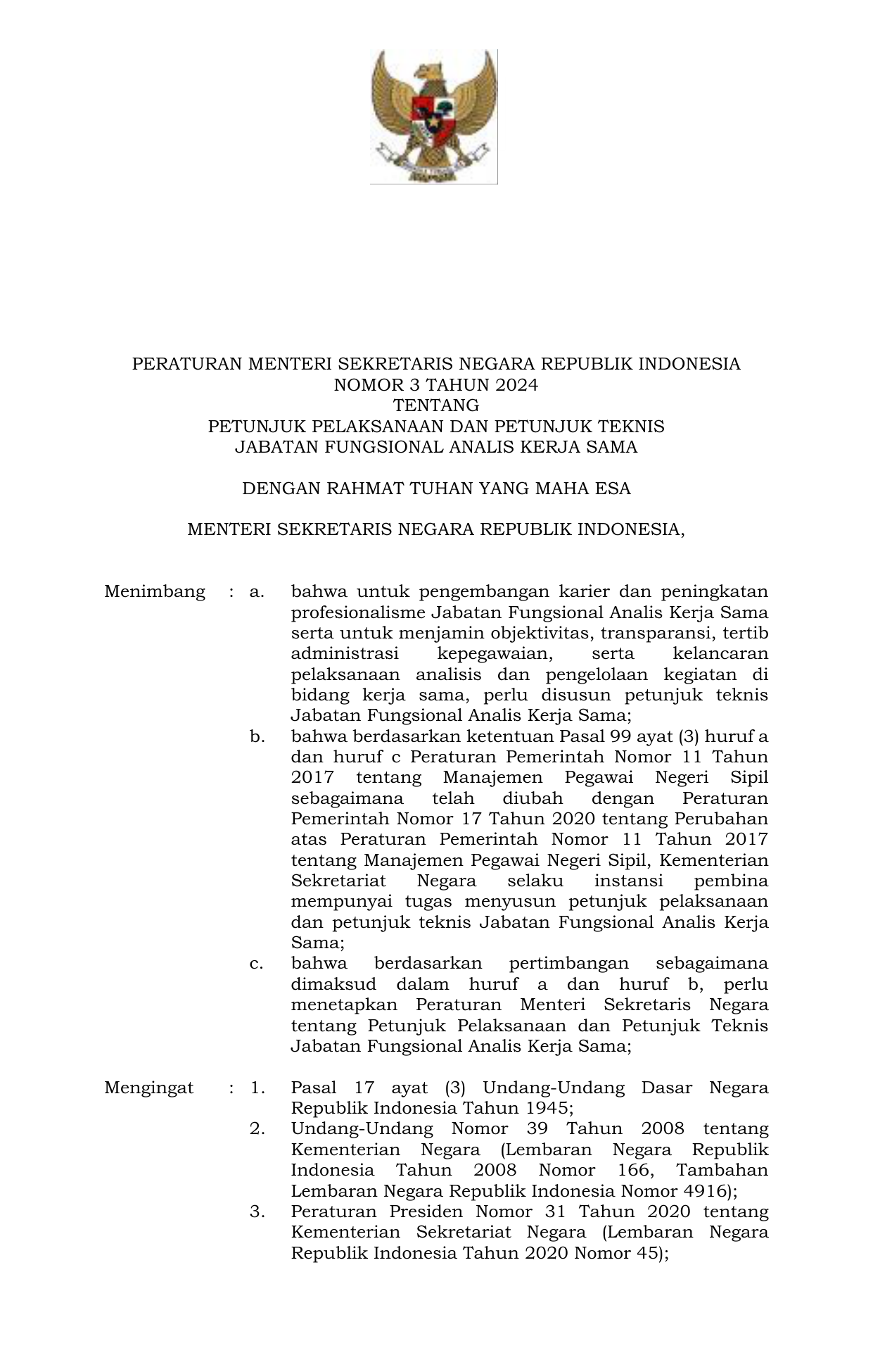 NOMOR 3 TAHUN 2024 TENTANG PETUNJUK PELAKSANAAN DAN PETUNJUK TEKNIS JABATAN FUNGSIONAL ANALIS KERJA SAMA