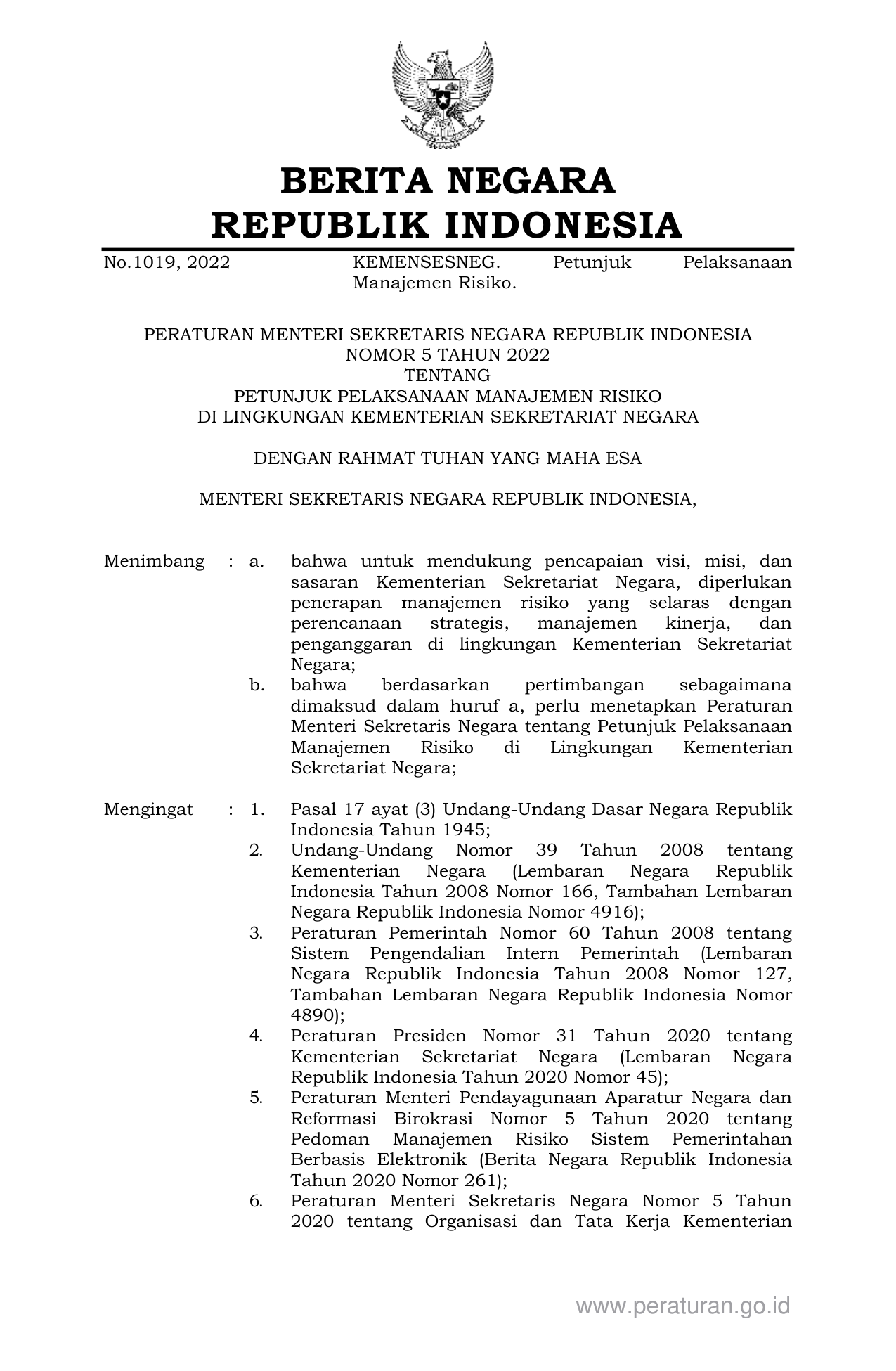 PERMEN Nomor 5 Tahun 2022 | Peraturan Menteri Nomor 5 Tahun 2022 tentang PETUNJUK PELAKSANAAN MANAJEMEN RISIKO DI LINGKUNGAN KEMENTERIAN SEKRETARIAT NEGARA