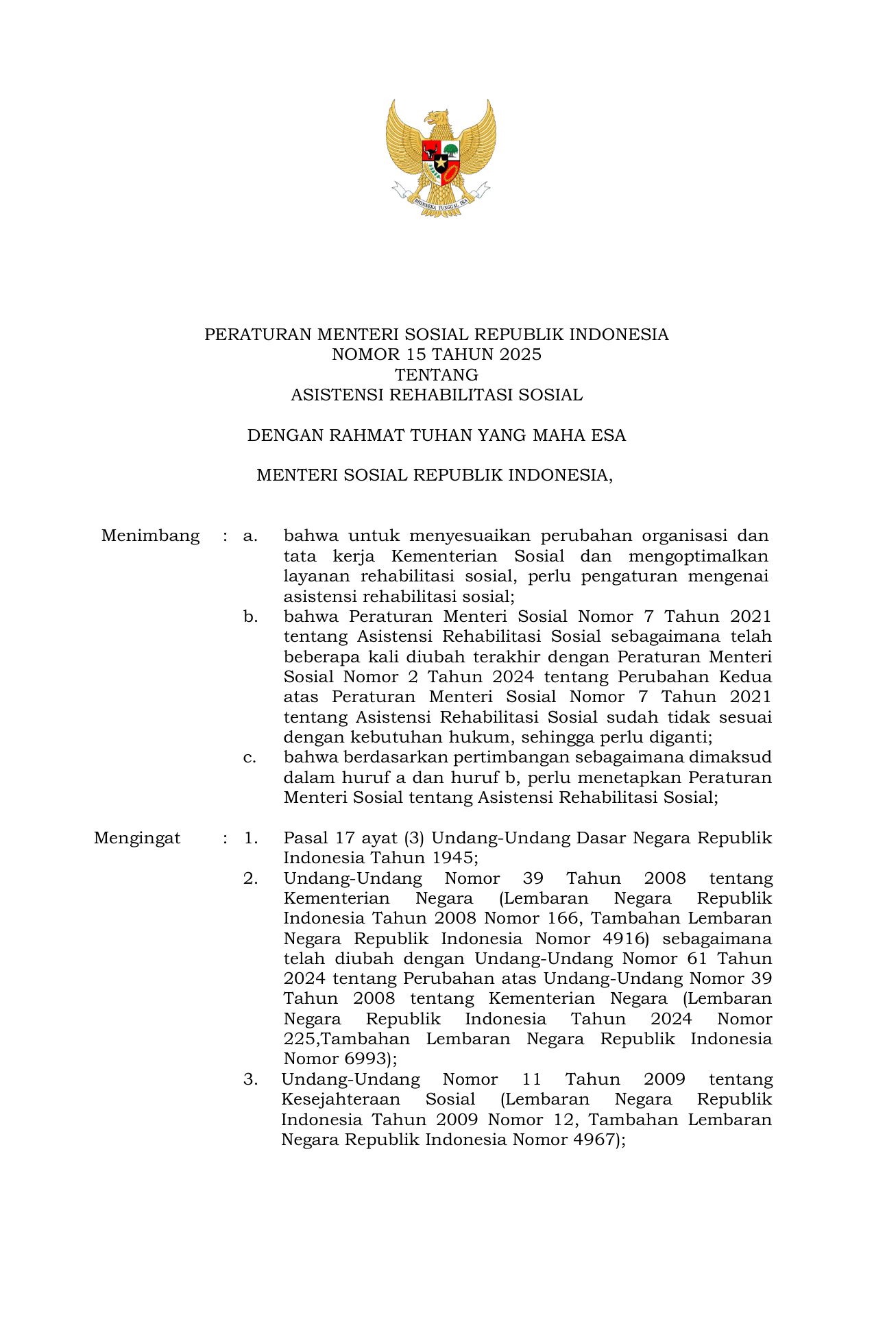 PERMEN Nomor 15 Tahun 2025 | Peraturan Menteri Nomor 15 Tahun 2025 tentang Asistensi Rehabilitasi Sosial