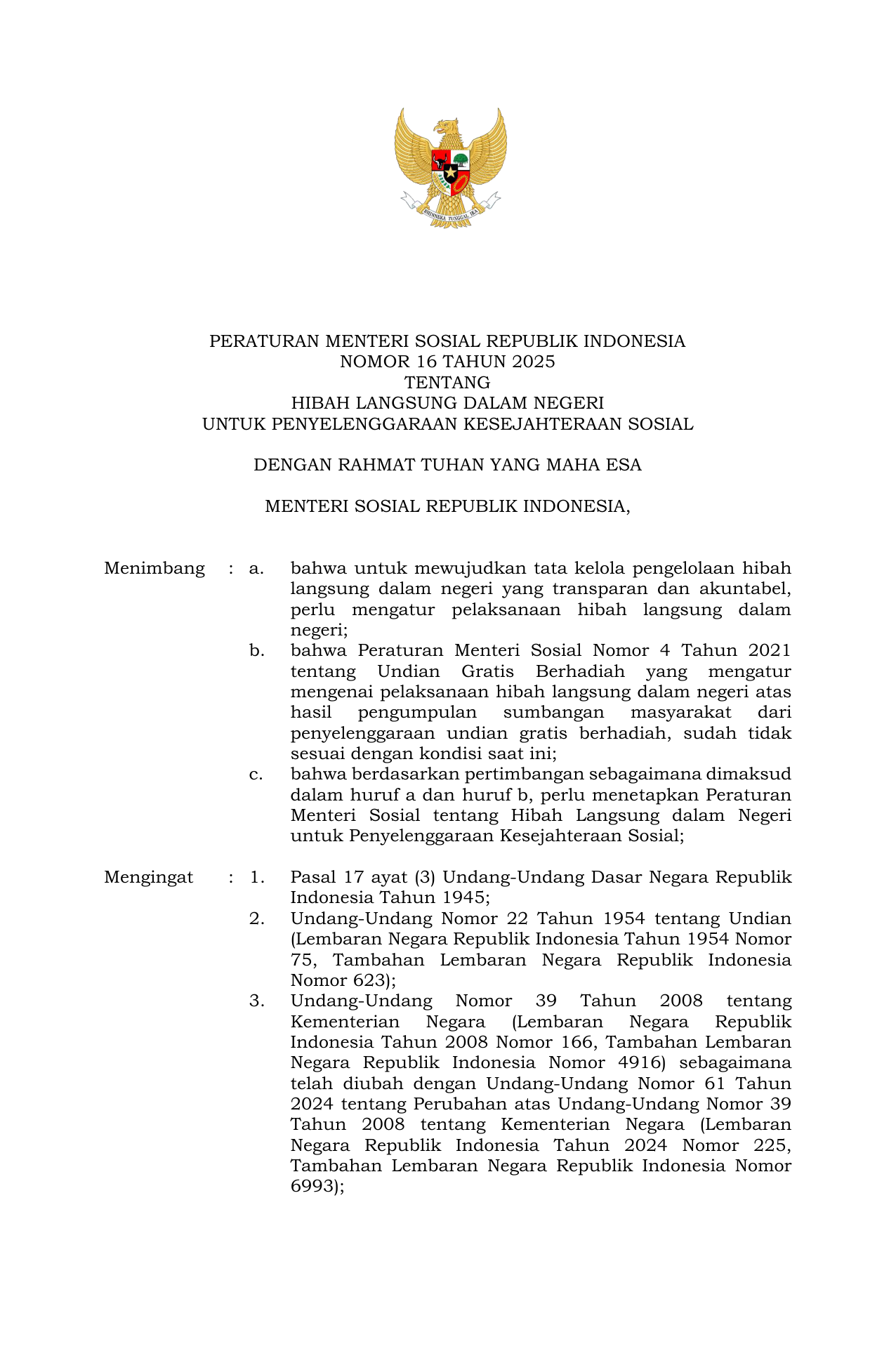 PERMEN Nomor 16 Tahun 2025 | Peraturan Menteri Nomor 16 Tahun 2025 tentang Hibah Langsung Dalam Negeri untuk Penyelenggaraan Kesejahteraan Sosial
