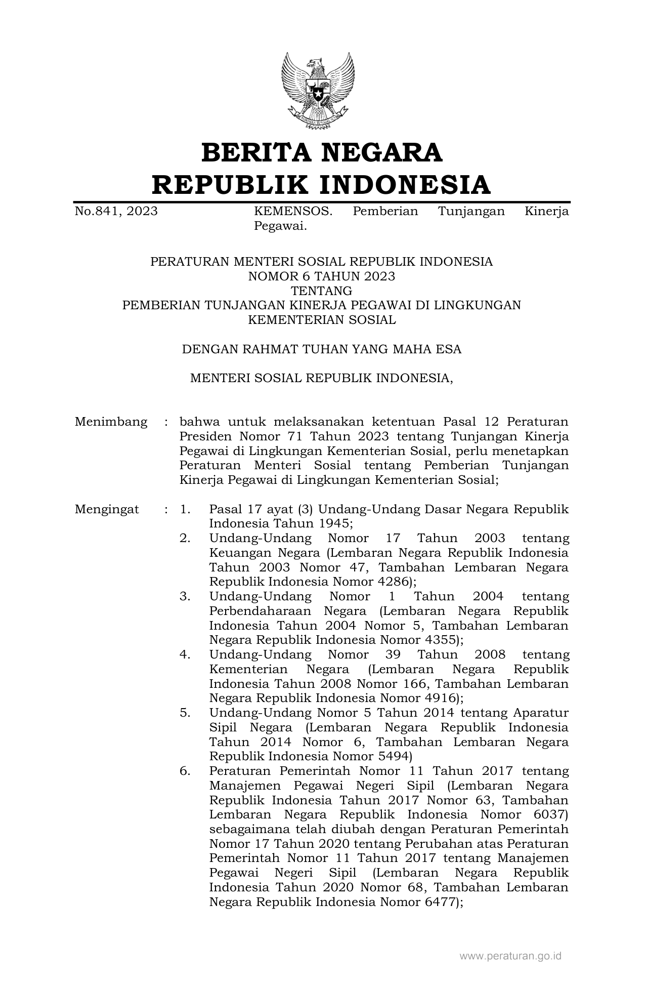 PERMEN Nomor 6 Tahun 2023 | Peraturan Menteri Nomor 6 Tahun 2023 tentang PEMBERIAN TUNJANGAN KINERJA PEGAWAI DI LINGKUNGAN KEMENTERIAN SOSIAL