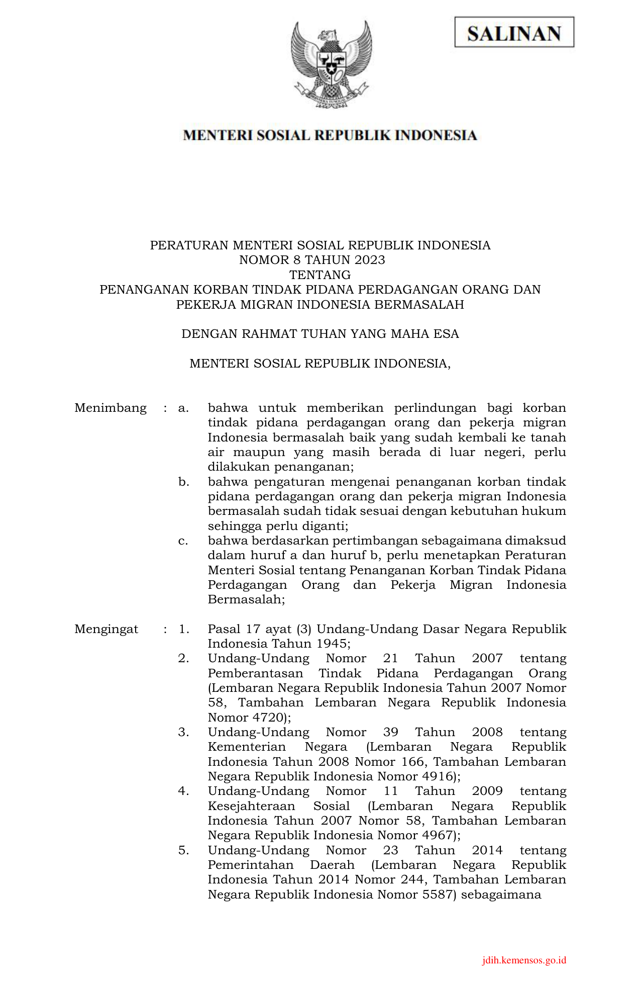 PERMEN Nomor 8 Tahun 2023 | Peraturan Menteri Nomor 8 Tahun 2023 tentang PENANGANAN KORBAN TINDAK PIDANA PERDAGANGAN ORANG DAN PEKERJA MIGRAN INDONESIA BERMASALAH