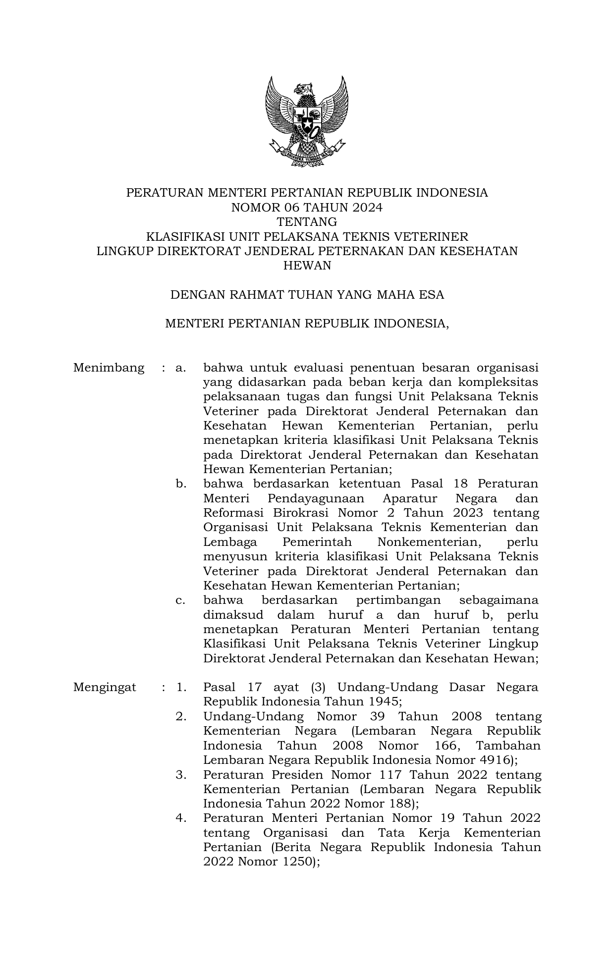 PERMEN Nomor 06 Tahun 2024 | Peraturan Menteri Nomor 06 Tahun 2024 tentang Klasifikasi Unit Pelaksana Teknis Veteriner Lingkup Direktorat Jenderal Peternakan dan Kesehatan Hewan