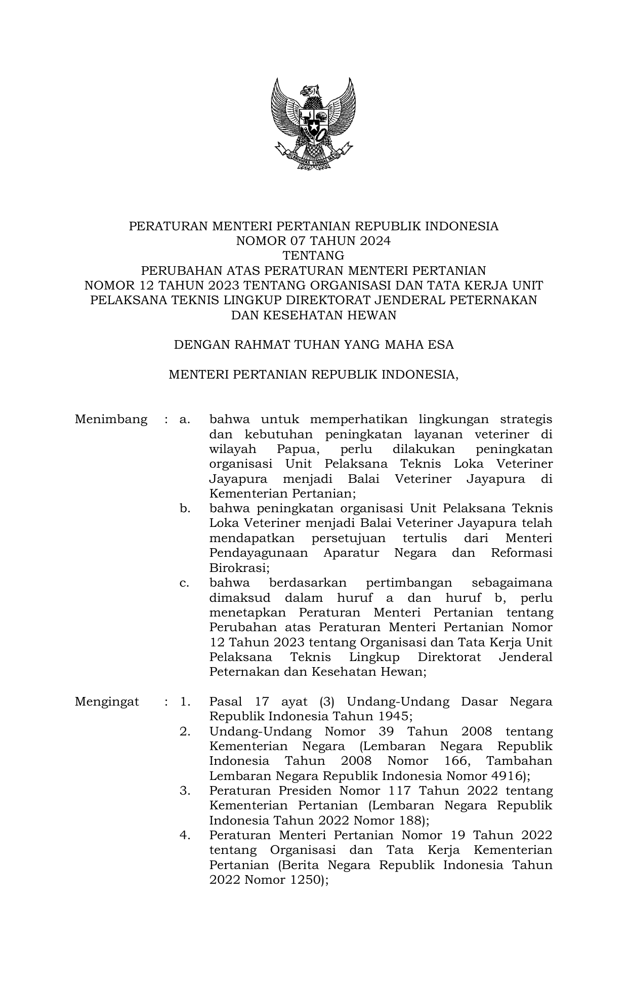 PERMEN Nomor 07 Tahun 2024 | Peraturan Menteri Nomor 07 Tahun 2024 tentang Perubahan atas Peraturan Menteri Pertanian Nomor 12 Tahun 2023 tentang Organisasi dan Tata Kerja Unit Pelaksana Teknis Lingkup Direktorat Jenderal Peternakan dan Kesehatan Hewan