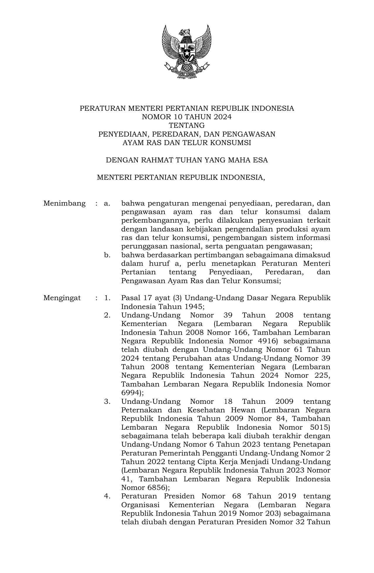 PERMEN Nomor 10 Tahun 2024 | Peraturan Menteri Nomor 10 Tahun 2024 tentang Penyediaan, Peredaran, dan Pengawasan Ayam Ras dan Telur Konsumsi