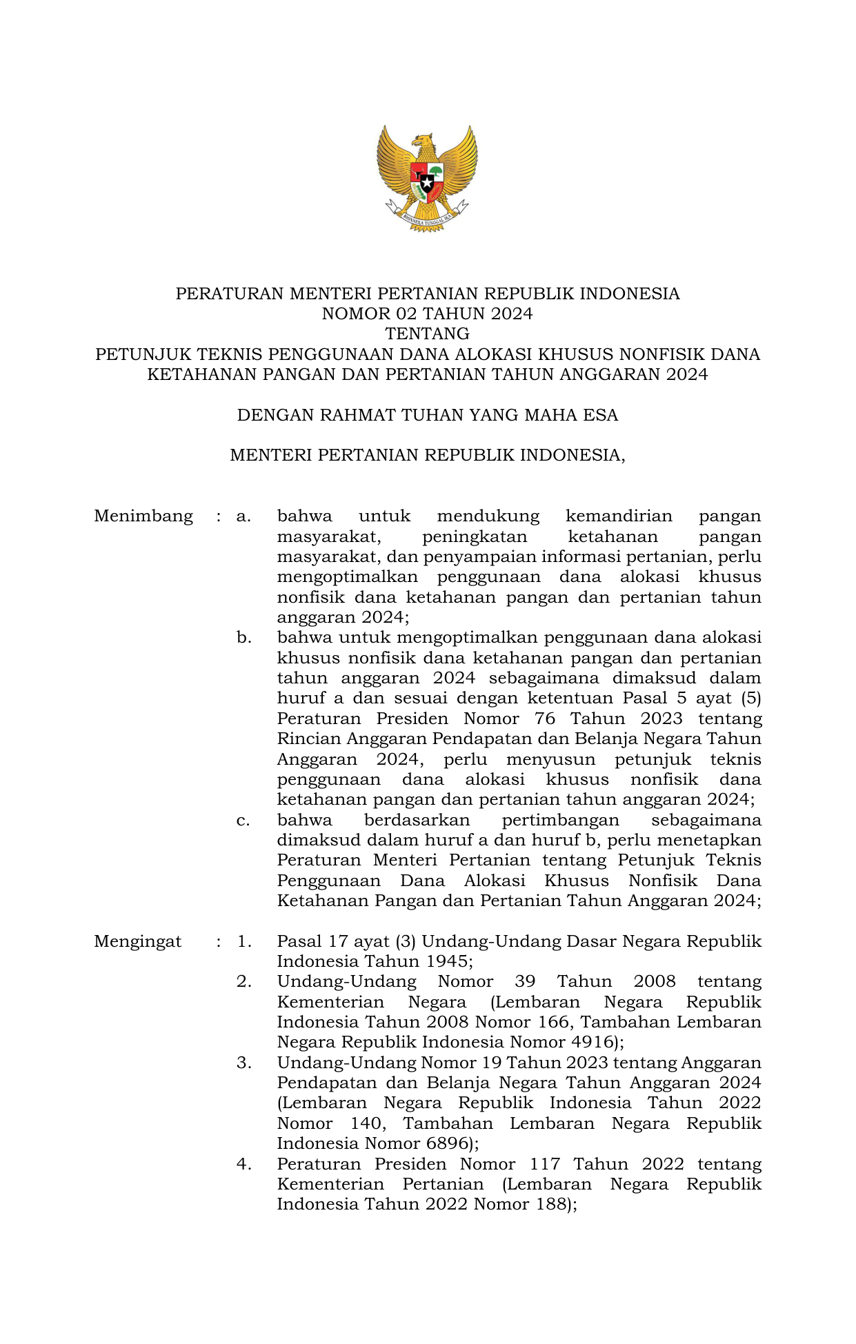 PERMEN Nomor 2 Tahun 2024 | Peraturan Menteri Nomor 2 Tahun 2024 tentang PETUNJUK TEKNIS PENGGUNAAN DANA ALOKASI KHUSUS NONFISIK DANA KETAHANAN PANGAN DAN PERTANIAN TAHUN ANGGARAN 2024