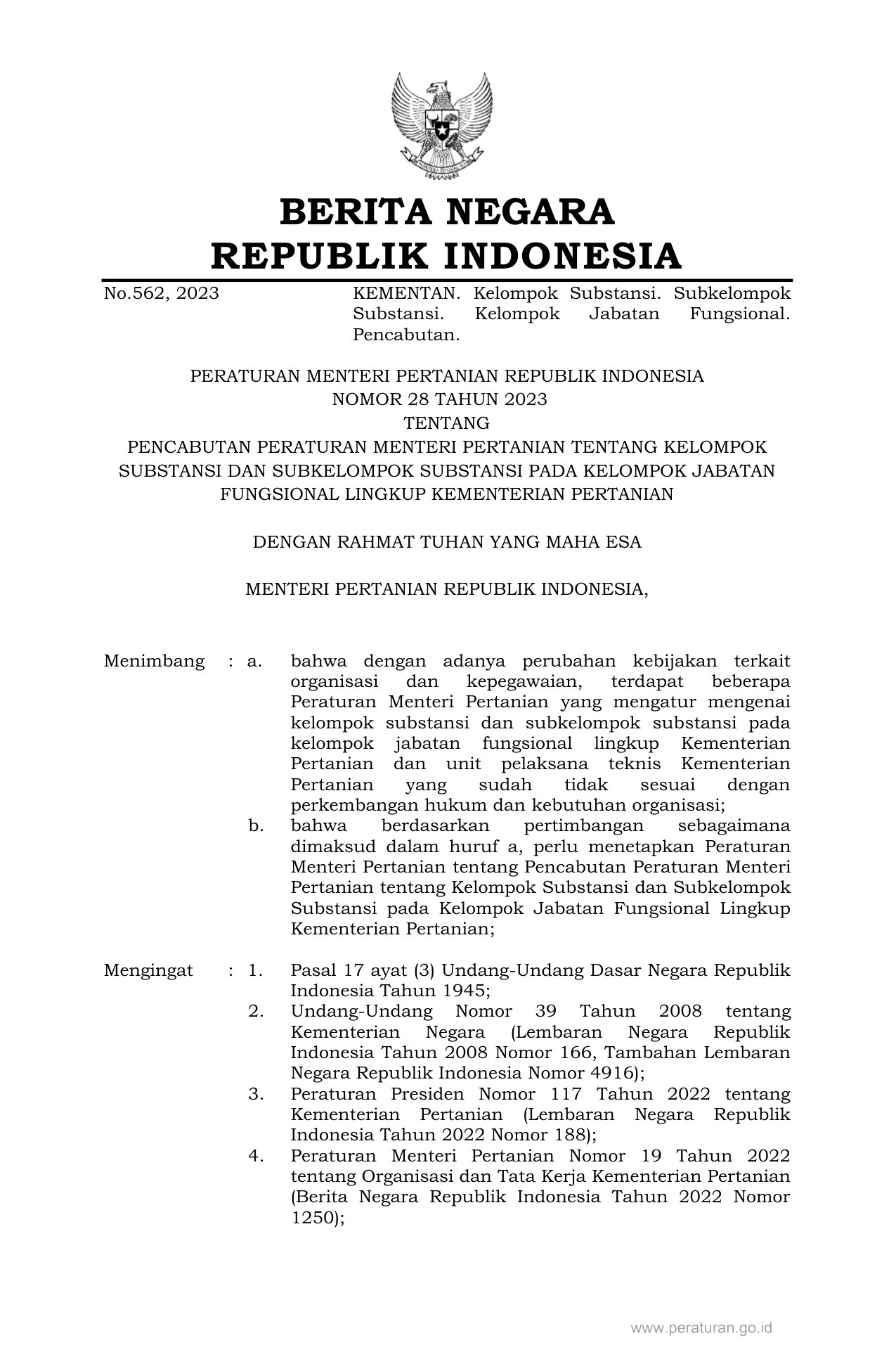 PERMEN Nomor 28 Tahun 2023 | Peraturan Menteri Nomor 28 Tahun 2023 tentang PENCABUTAN PERATURAN MENTERI PERTANIAN TENTANG KELOMPOK SUBSTANSI DAN SUBKELOMPOK SUBSTANSI PADA KELOMPOK JABATAN FUNGSIONAL LINGKUP KEMENTERIAN PERTANIAN