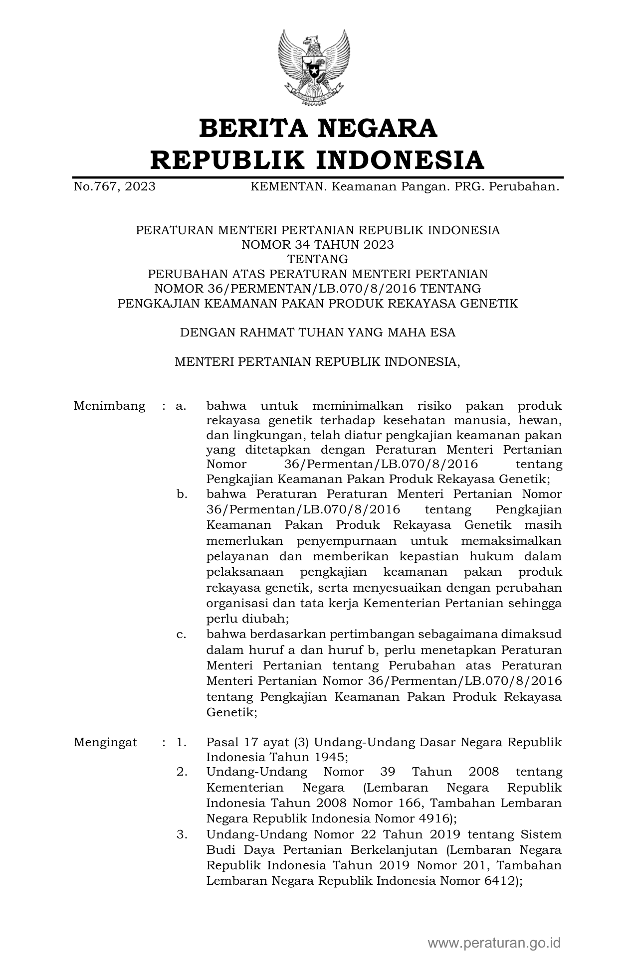 PERMEN Nomor 34 Tahun 2023 | Peraturan Menteri Nomor 34 Tahun 2023 tentang PERUBAHAN ATAS PERATURAN MENTERI PERTANIAN NOMOR 36/PERMENTAN/LB.070/8/2016 TENTANG PENGKAJIAN KEAMANAN PAKAN PRODUK REKAYASA GENETIK