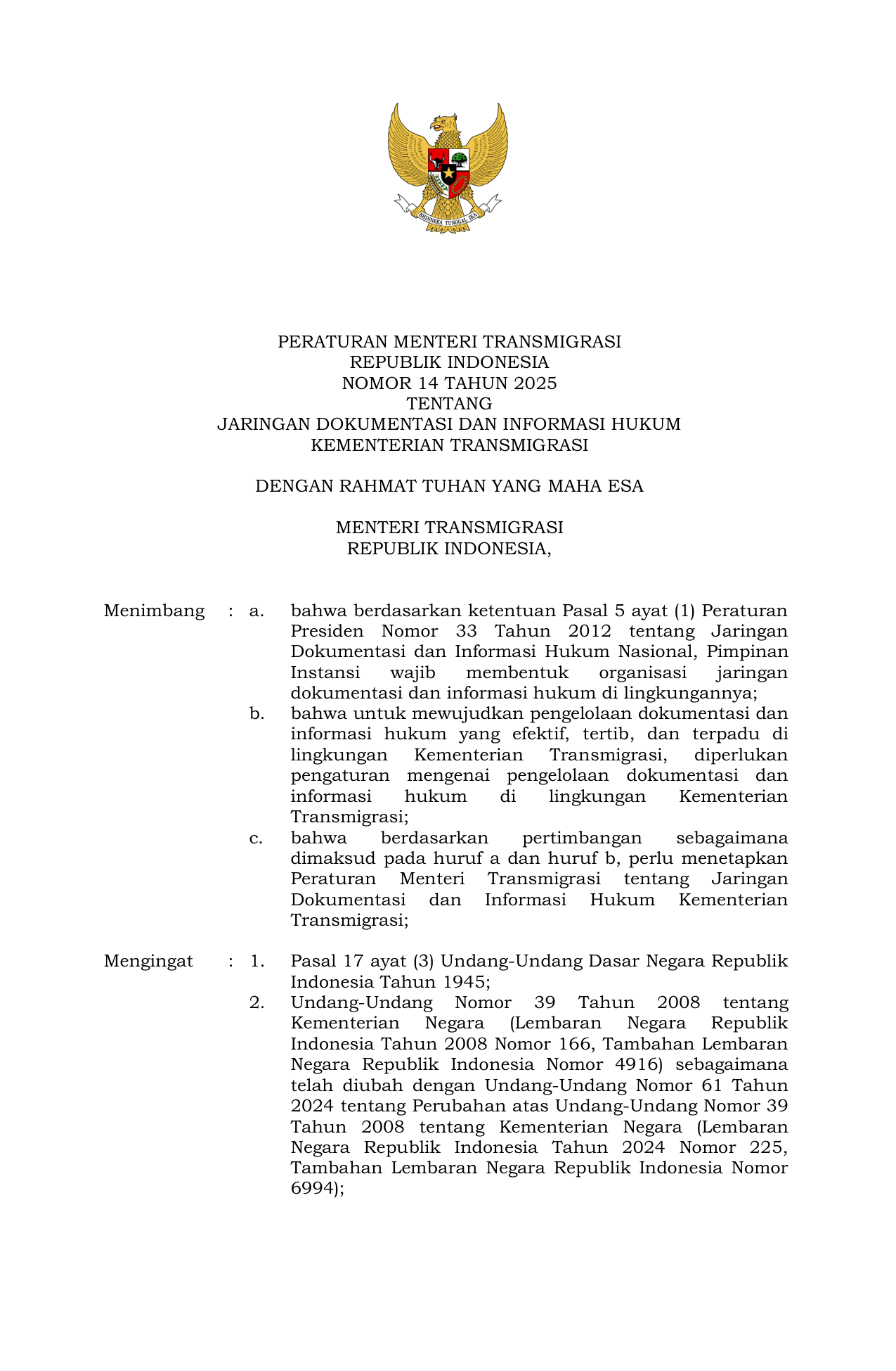PERMEN Nomor 14 Tahun 2025 | Peraturan Menteri Nomor 14 Tahun 2025 tentang Jaringan Dokumentasi dan Informasi Hukum Kementerian Transmigrasi