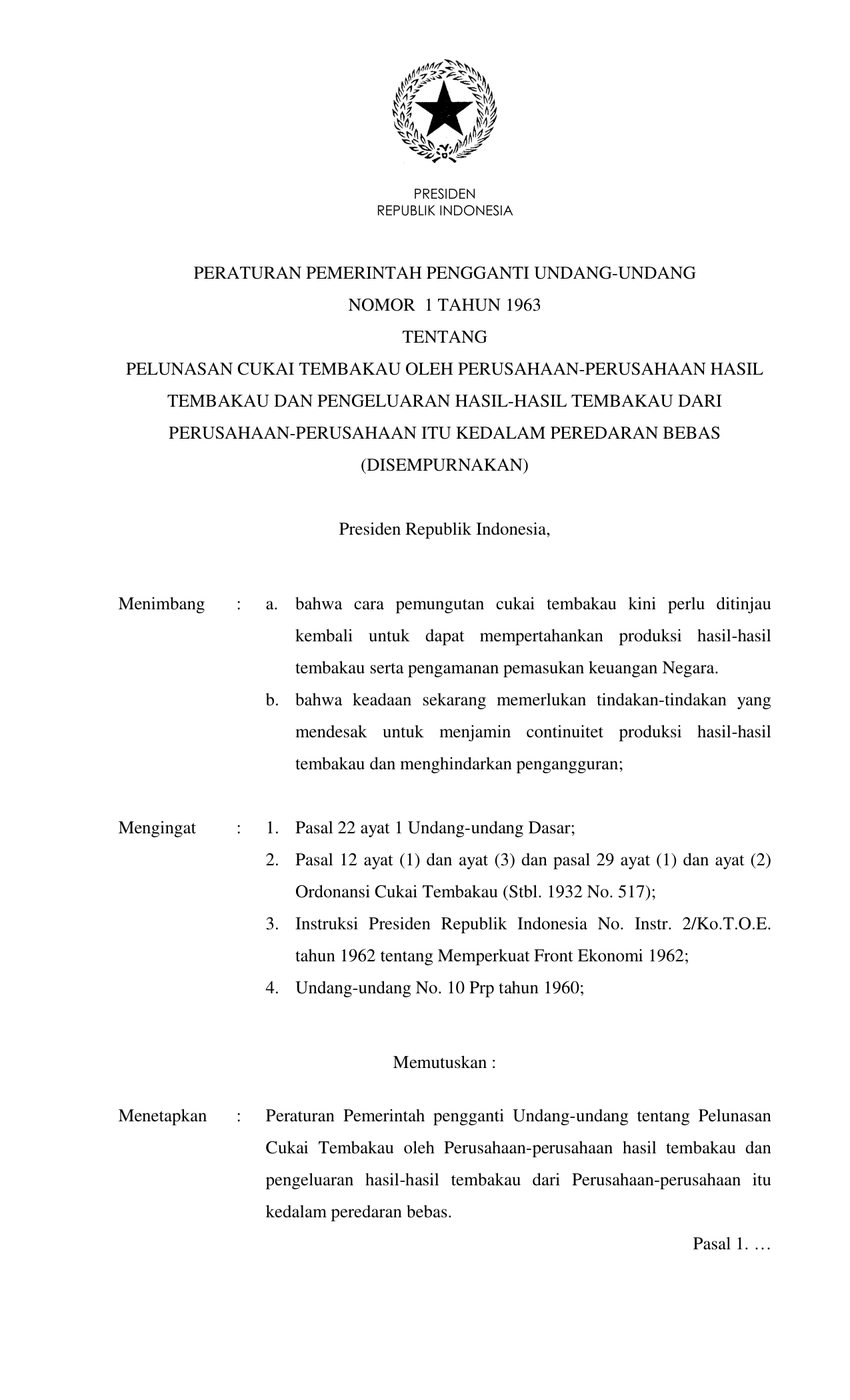 PERPPU Nomor 1 Tahun 1963 | Peraturan Pemerintah Pengganti Undang-Undang Nomor 1 Tahun 1963 tentang PELUNASAN CUKAI TEMBAKAU OLEH PERUSAHAAN-PERUSAHAAN HASIL TEMBAKAU DAN PENGELUARAN HASIL-HASIL TEMBAKAU DARI PERUSAHAAN-PERUSAHAAN ITU KEDALAM PEREDARAN BEBAS (DISEMPURNAKAN)