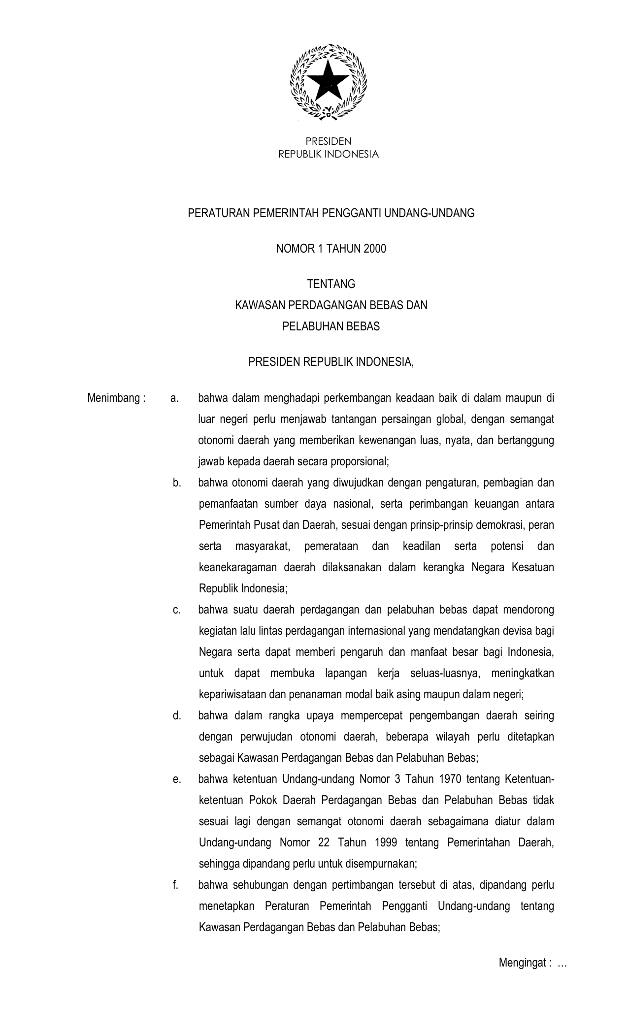 PERPPU Nomor 1 Tahun 2000 | Peraturan Pemerintah Pengganti Undang-Undang Nomor 1 Tahun 2000 tentang KAWASAN PERDAGANGAN BEBAS DAN PELABUHAN BEBAS