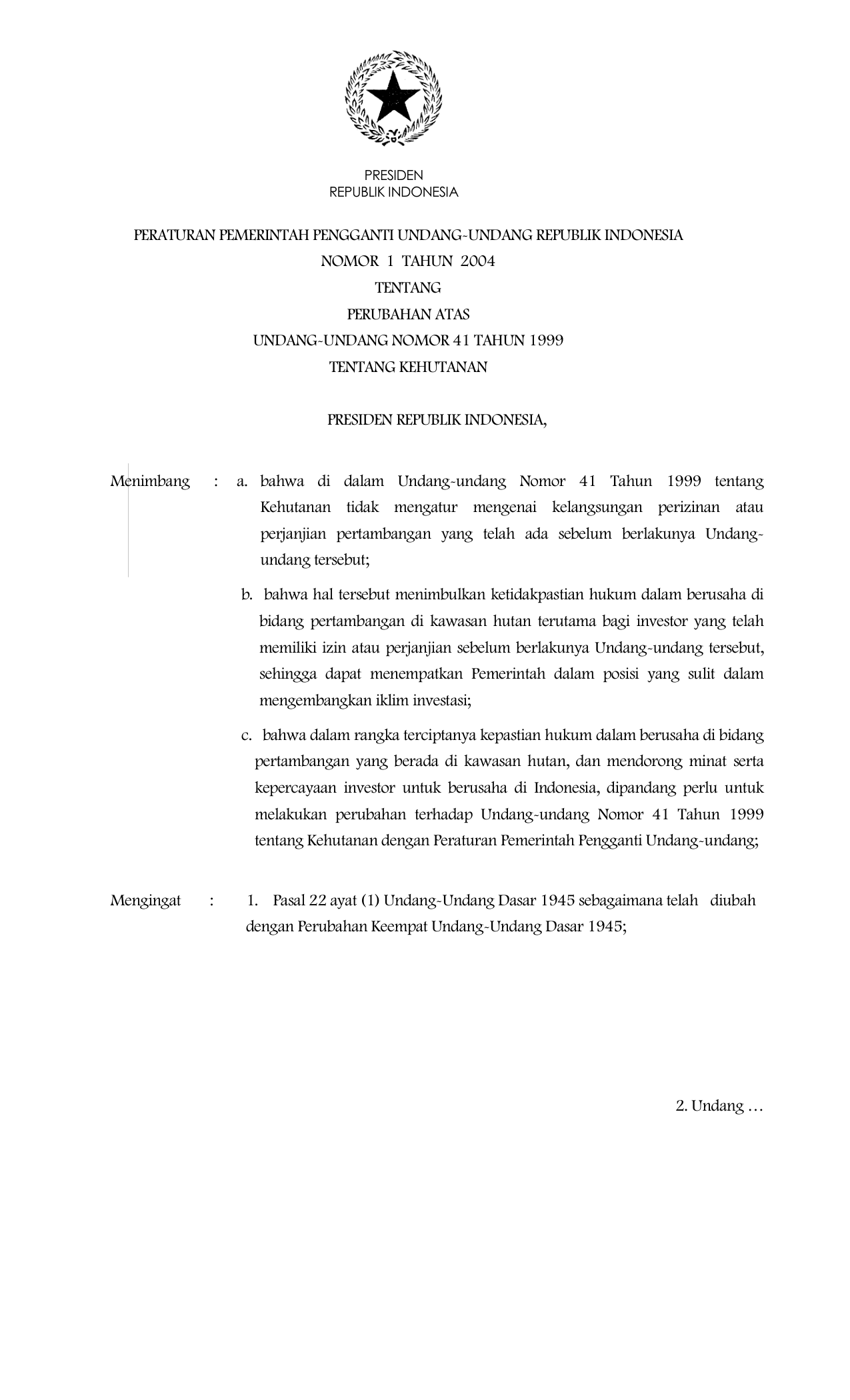 PERPPU Nomor 1 Tahun 2004 | Peraturan Pemerintah Pengganti Undang-Undang Nomor 1 Tahun 2004 tentang PERUBAHAN UU 41-1999 TENTANG KEHUTANAN