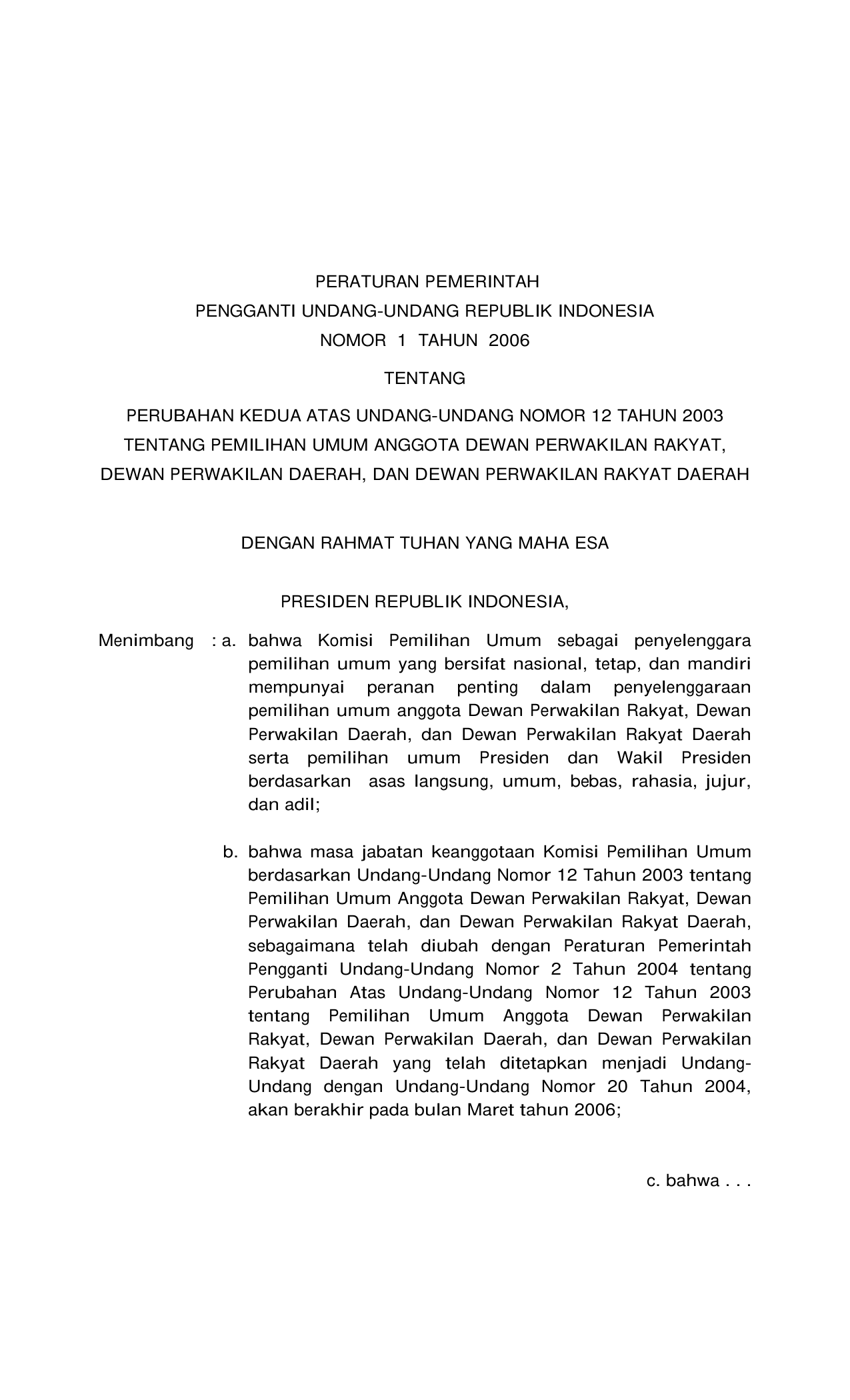 PERPPU Nomor 1 Tahun 2006 | Peraturan Pemerintah Pengganti Undang-Undang Nomor 1 Tahun 2006 tentang PERUBAHAN KEDUA UU 12-2003 TENTANG PEMILIHAN UMUM ANGGOTA DEWAN PERWAKILAN RAKYAT, DEWAN PERWAKILAN DAERAH, DAN DEWAN PERWAKILAN RAKYAT DAERAH