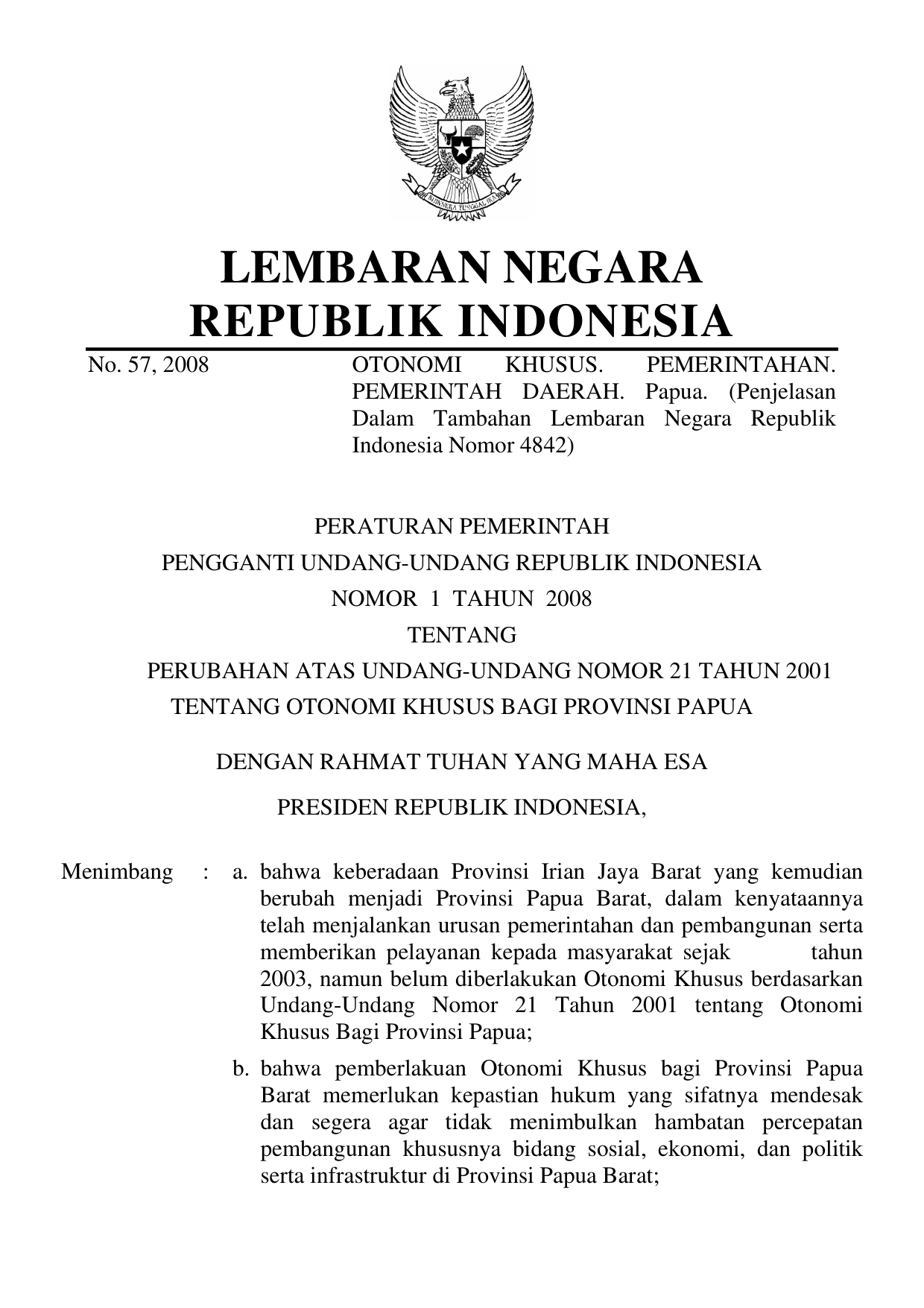 PERPPU Nomor 1 Tahun 2008 | Peraturan Pemerintah Pengganti Undang-Undang Nomor 1 Tahun 2008 tentang PERUBAHAN UU 21-2001 TENTANG OTONOMI KHUSUS BAGI PROVINSI PAPUA
