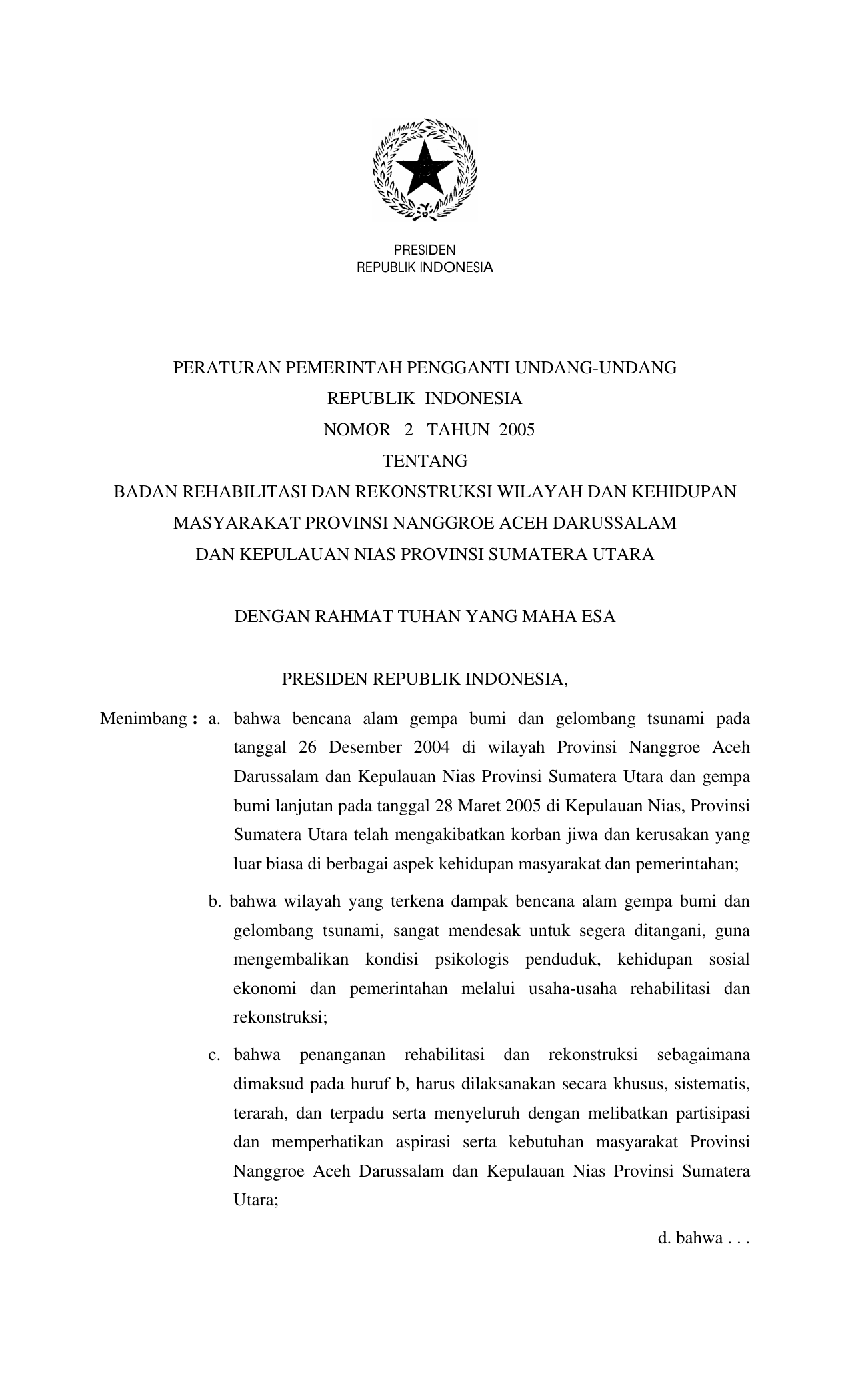 PERPPU Nomor 2 Tahun 2005 | Peraturan Pemerintah Pengganti Undang-Undang Nomor 2 Tahun 2005 tentang BADAN REHABILITASI DAN REKONSTRUKSI WILAYAH DAN KEHIDUPAN MASYARAKAT PROVINSI NANGGROE ACEH DARUSSALAM DAN KEPULAUAN NIAS PROVINSI SUMATERA UTARA