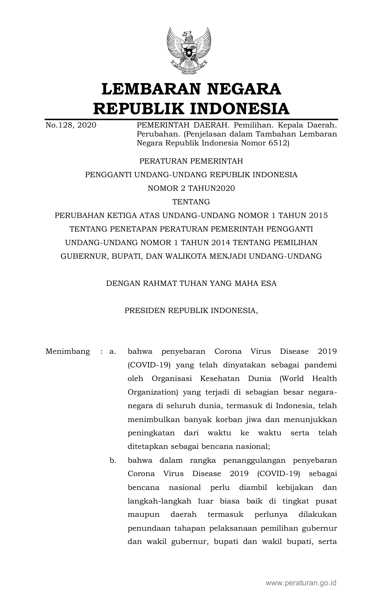 PERPPU Nomor 2 Tahun 2020 | Peraturan Pemerintah Pengganti Undang-Undang Nomor 2 Tahun 2020 tentang PERUBAHAN KETIGA ATAS UNDANG-UNDANG NOMOR 1 TAHUN 2015 TENTANG PENETAPAN PERATURAN PEMERINTAH PENGGANTI UNDANG-UNDANG NOMOR 1 TAHUN 2014 TENTANG PEMILIHAN GUBERNUR, BUPATI, DAN WALIKOTA MENJADI UNDANG-UNDANG
